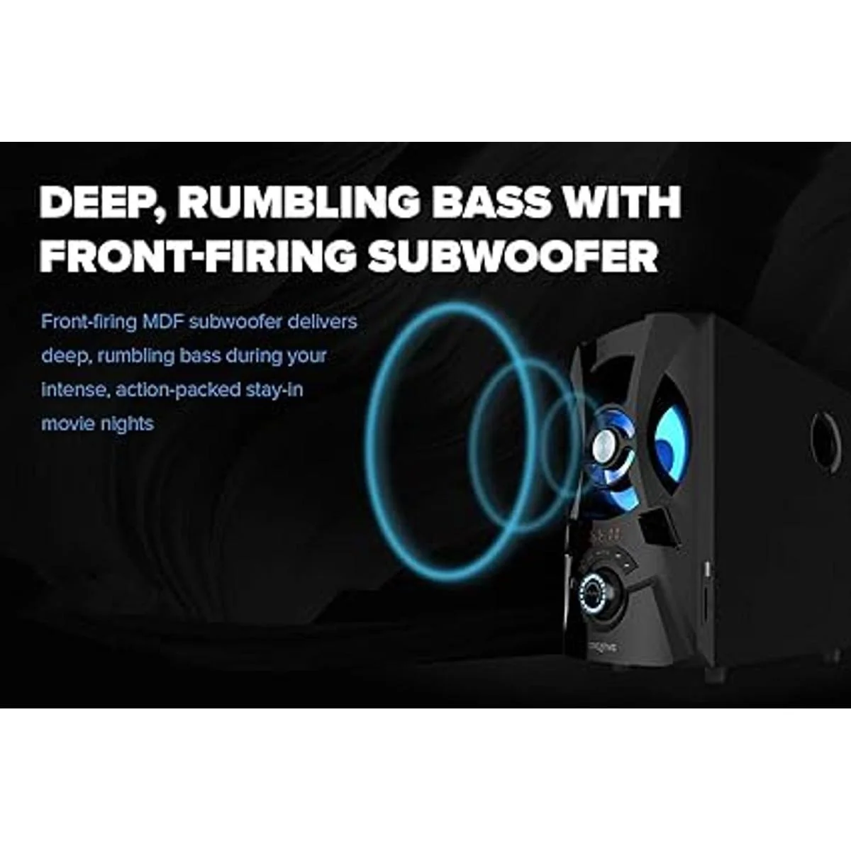 Subwoofer de disparo frontal para graves geniales: escucha el rugido de los graves mientras el subwoofer MDF de disparo frontal ofrece graves profundos y ruidosos durante tus intensas noches de cine llenas de acción o mejor aún, transforma tu casa en una casa club de fiesta con tus canciones favoritas