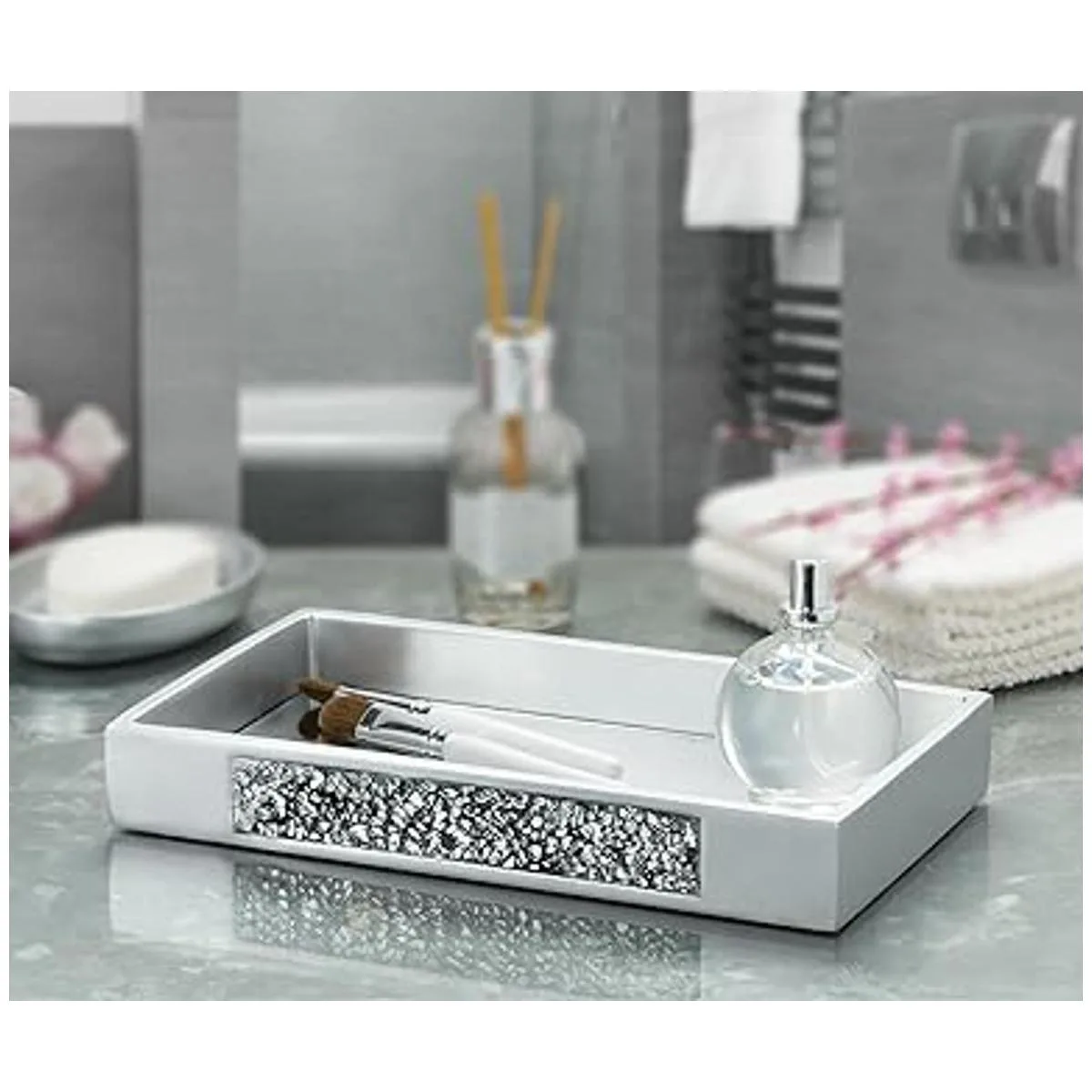 Idea de regalo única: combina estas bandejas de baño para encimera con otros accesorios de baño plateados de la colección Mirror Mosaic para crear un juego de regalo verdaderamente memorable.