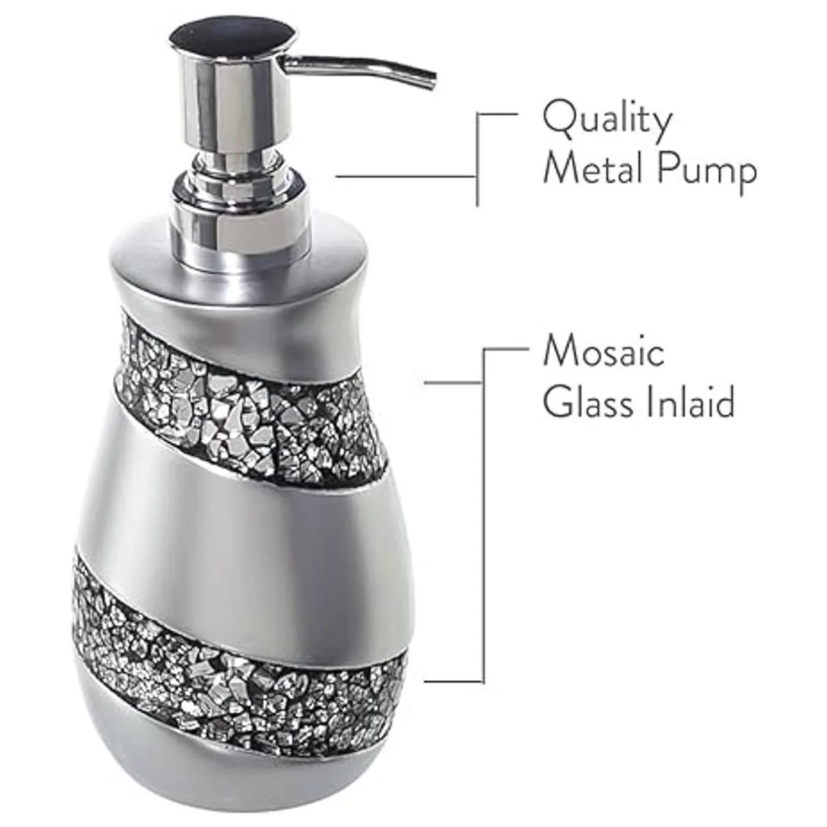 Toque de clase: nuestro dispensador de jabón de manos para deportes de baño cautivador color plateado con hermoso patrón de vidrio de mosaico de alta clase y forma elegante para decorar la decoración de tu baño.