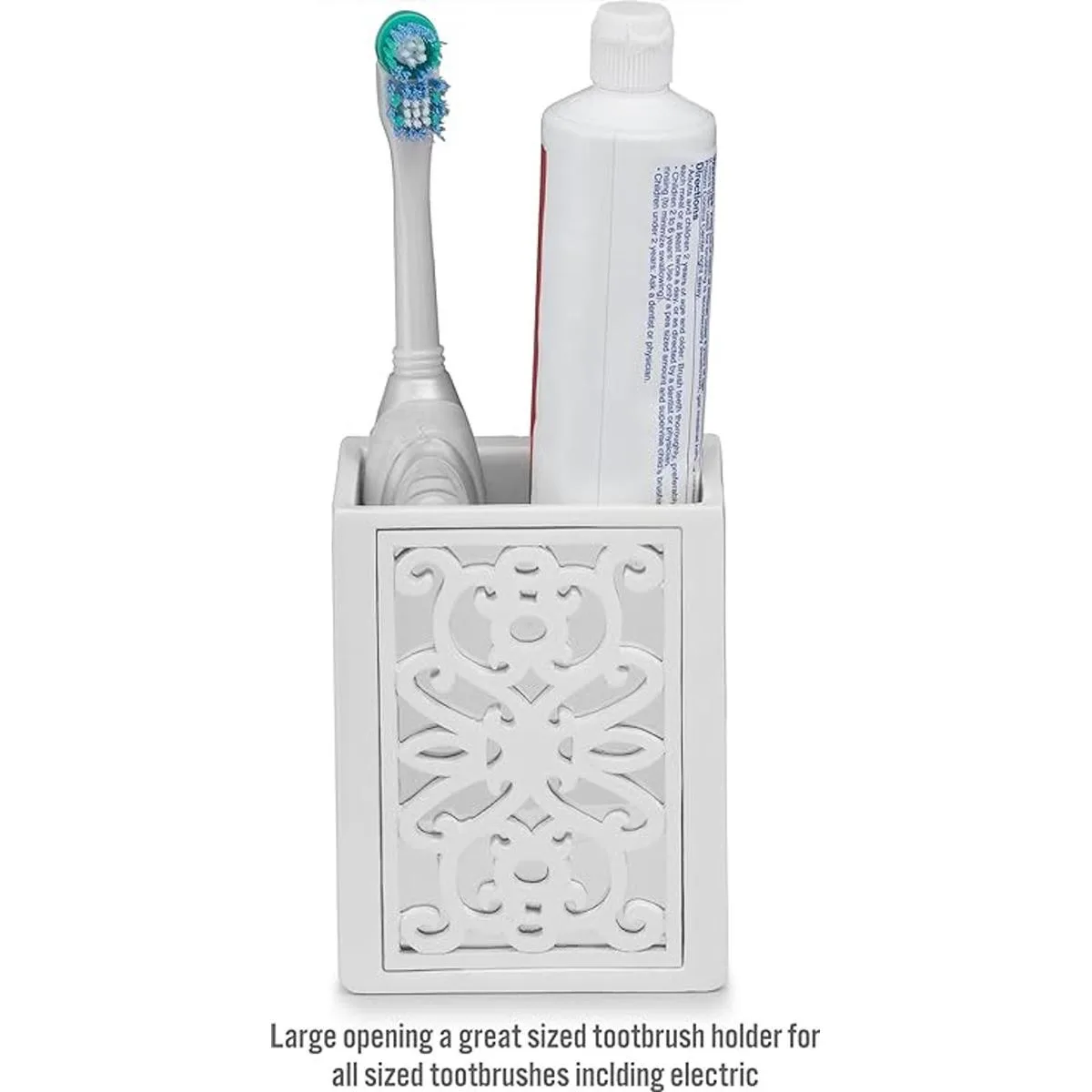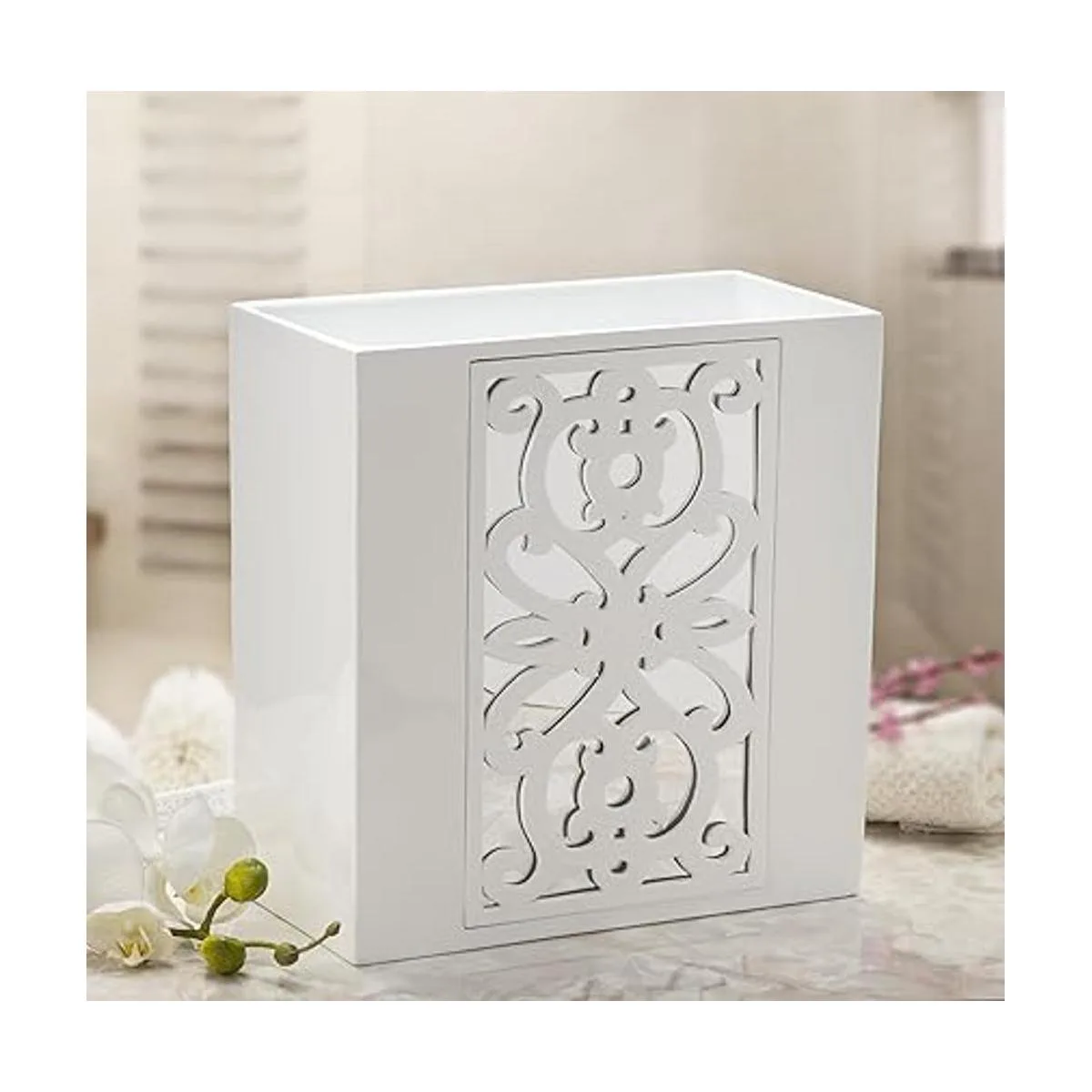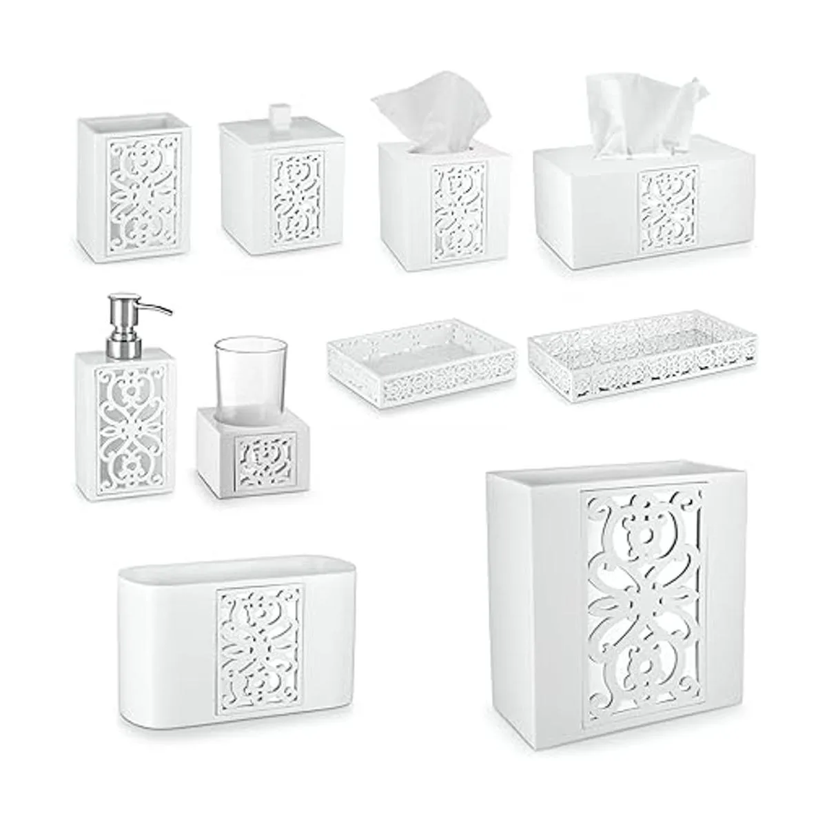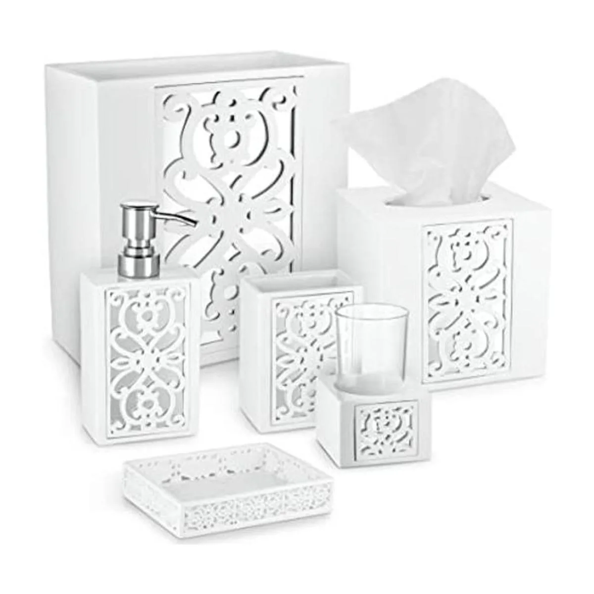 Creative Scents Juego completo de accesorios de baño blancos El juego de baño de 6 piezas incluye dispensador de jabón, soporte para cepillos de dientes, taza de vaso, jabonera, cubierta de pañuelos y espejo de cesta de basura estilo Janette
