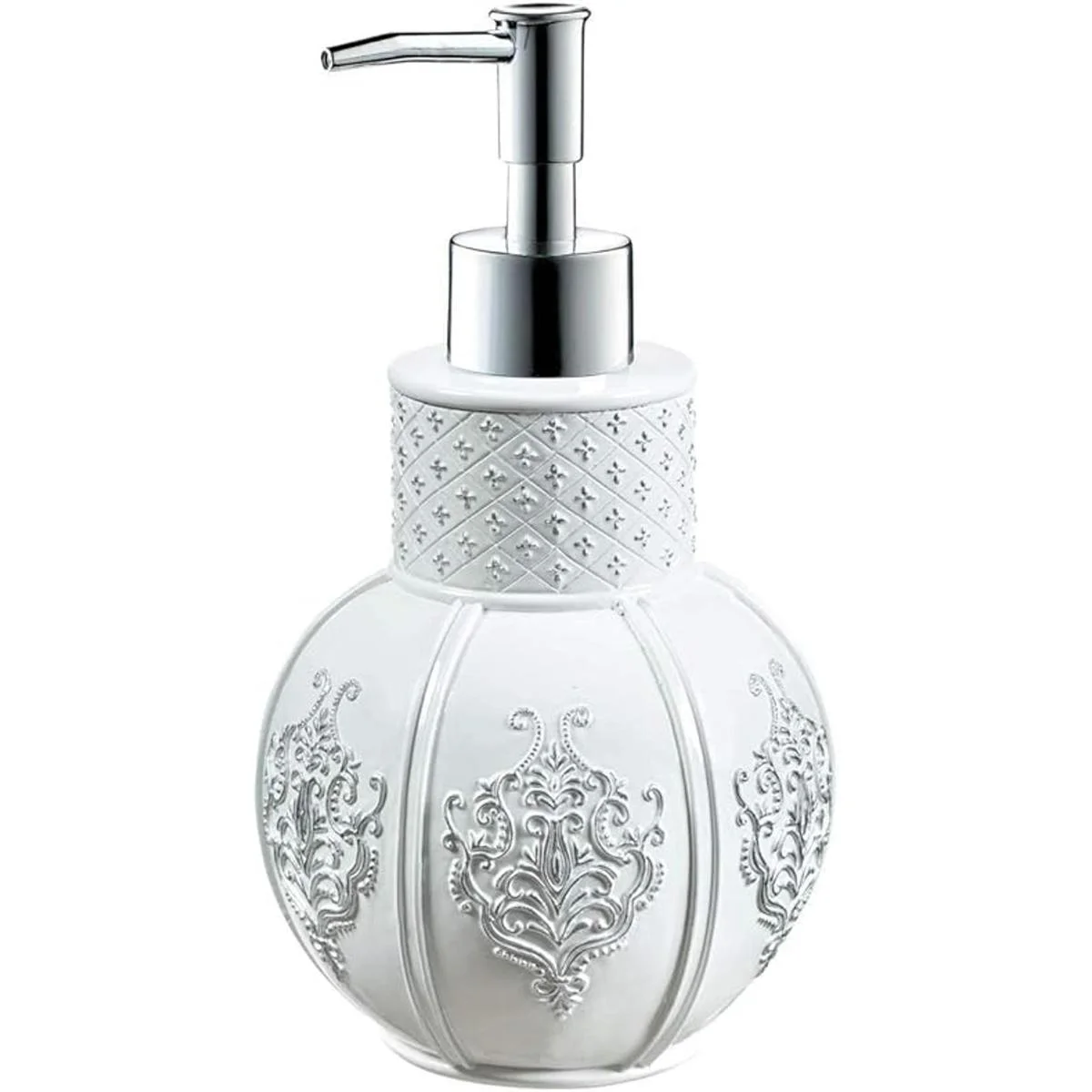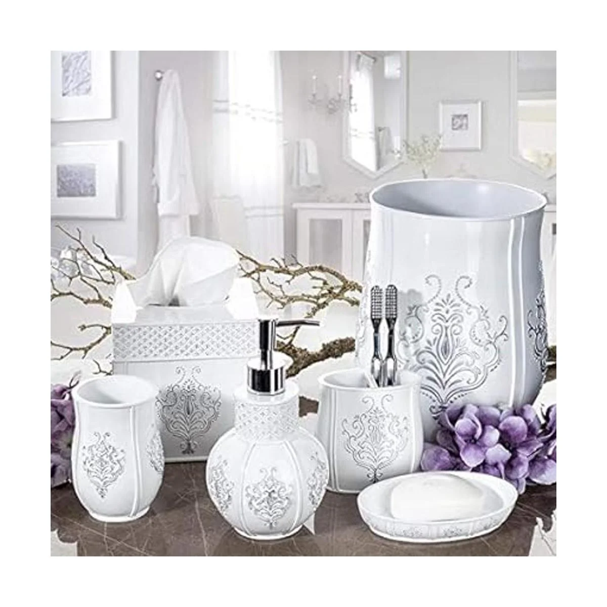 Timeless Elegance and Universal Color: the curves, raised details of the silver colored French fleur delis motif combine to give the design a vintage look and feel that brings sophistication and style to any bathroom. Whatever your bathroom color scheme, this pristine white bathroom set will blend in perfectly; enhancing your décor with the splendor of French design thatll definitely impress your guests