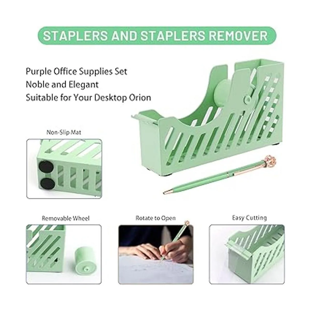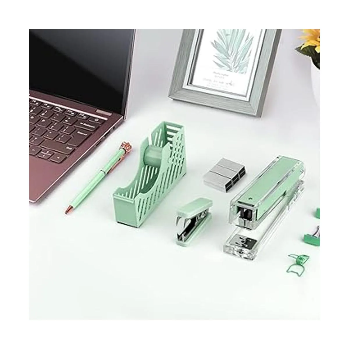 Juego perfecto: el juego de papelería de oficina Creechwa está hecho de material acrílico transparente de alta calidad y pintura en aerosol de acero inoxidable, el juego de accesorios de escritorio verde incluye dispensador de cinta, grapadora, removedor de grapas, 1000 grapas, bolígrafo y exquisita caja de regalo.