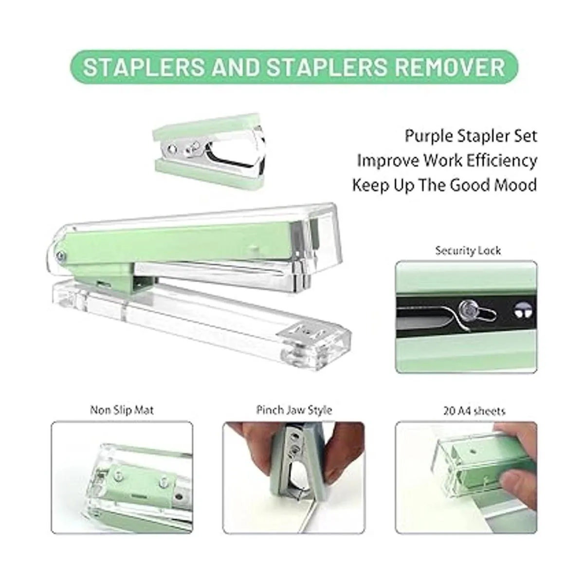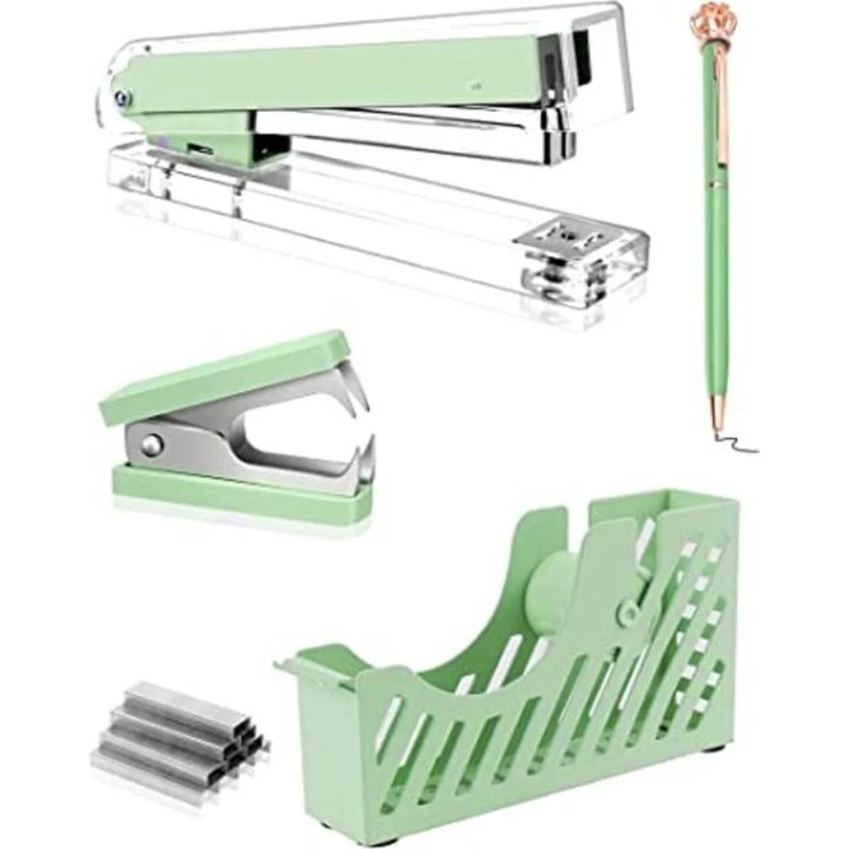 Creechwa Kit de accesorios de escritorio verde, juego de grapadoras acrílicas, juego de suministros de oficina para mujeres y estudiantes, con dispensador de cinta, removedor de grapas, bolígrafo, 1000 grapas, bolsa de regalo y cajas de regalo
