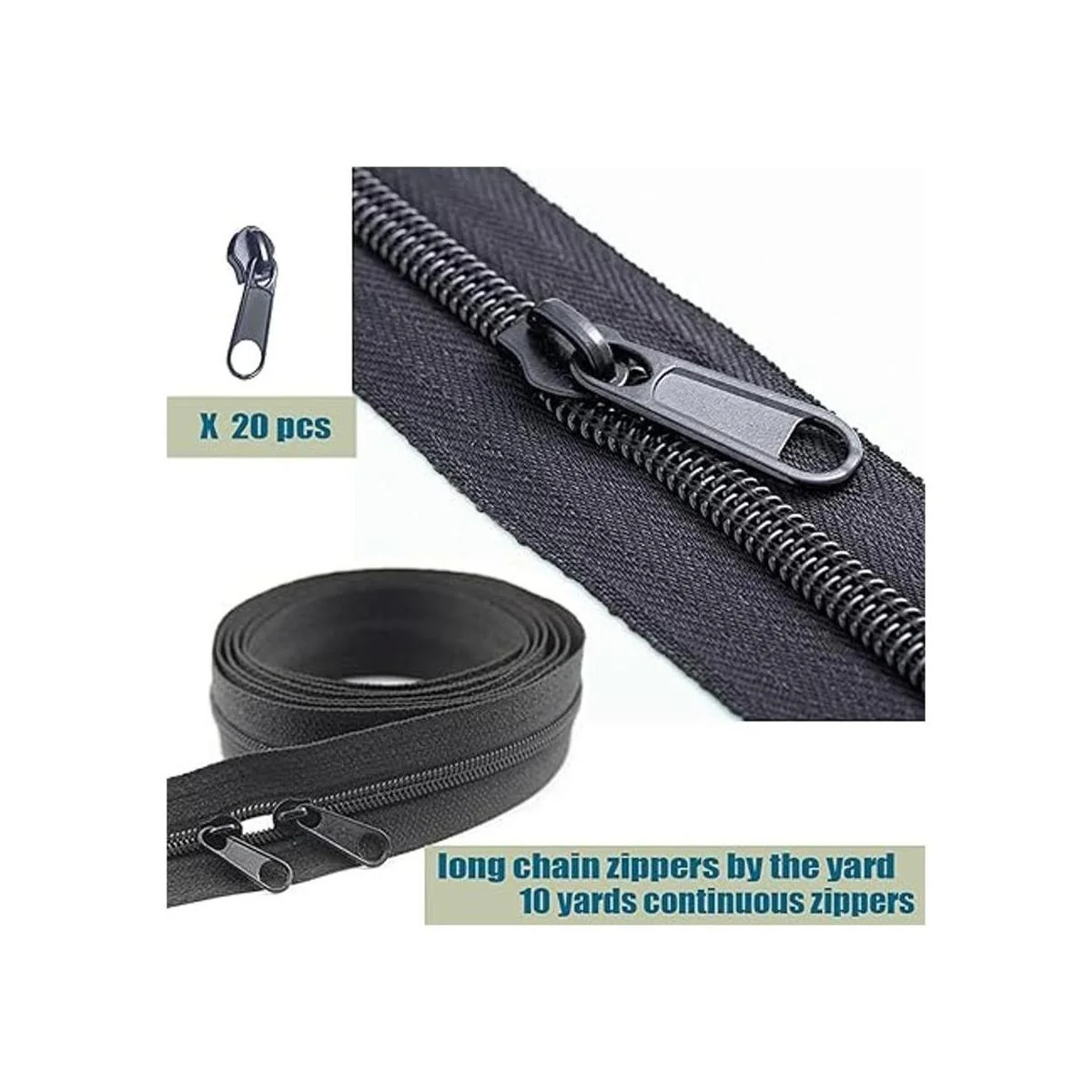 Cantidad de cremallera: cremalleras de cadena larga por patio, cremalleras continuas de 10 yardas 20 deslizadores negros a juego sin bloqueo con tirador.