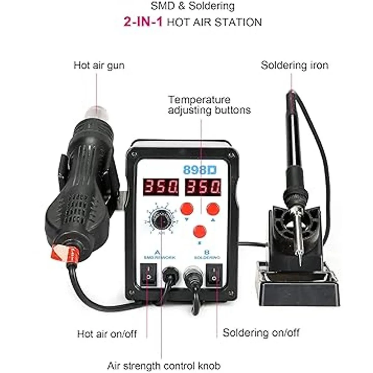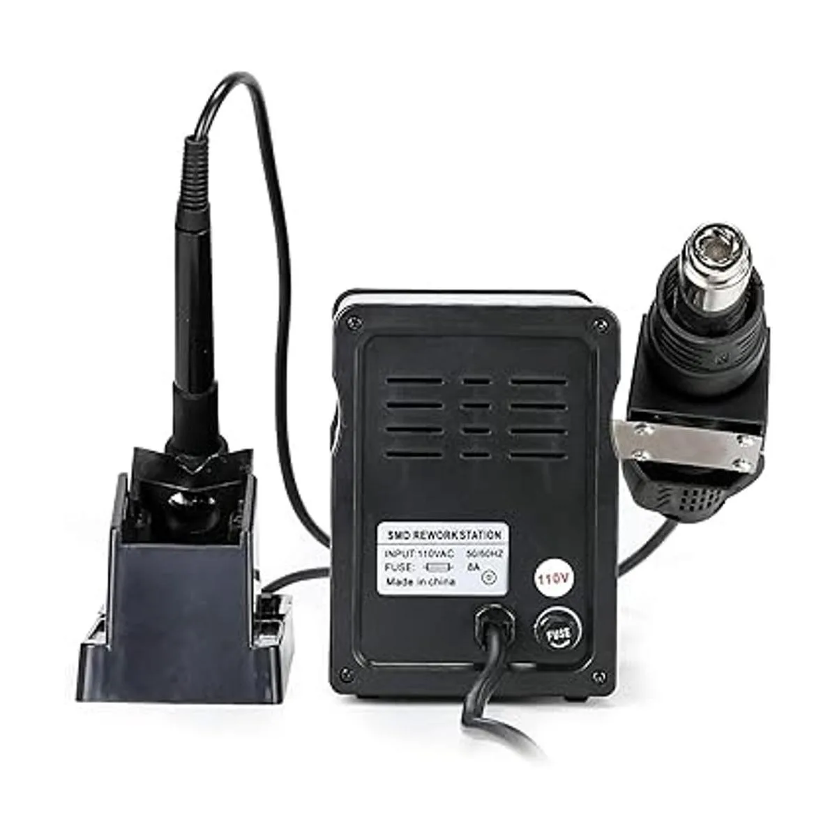 Dos en uno. el voltaje de este producto es de 110 V. La estación de retrabajo y la estación de soldadura se combinan en uno, y puedes controlar por separado la retrabajo y la soldadura SMD. Esta máquina te ahorrará espacio, dinero y mantendrá tu escritorio de trabajo bien organizado.