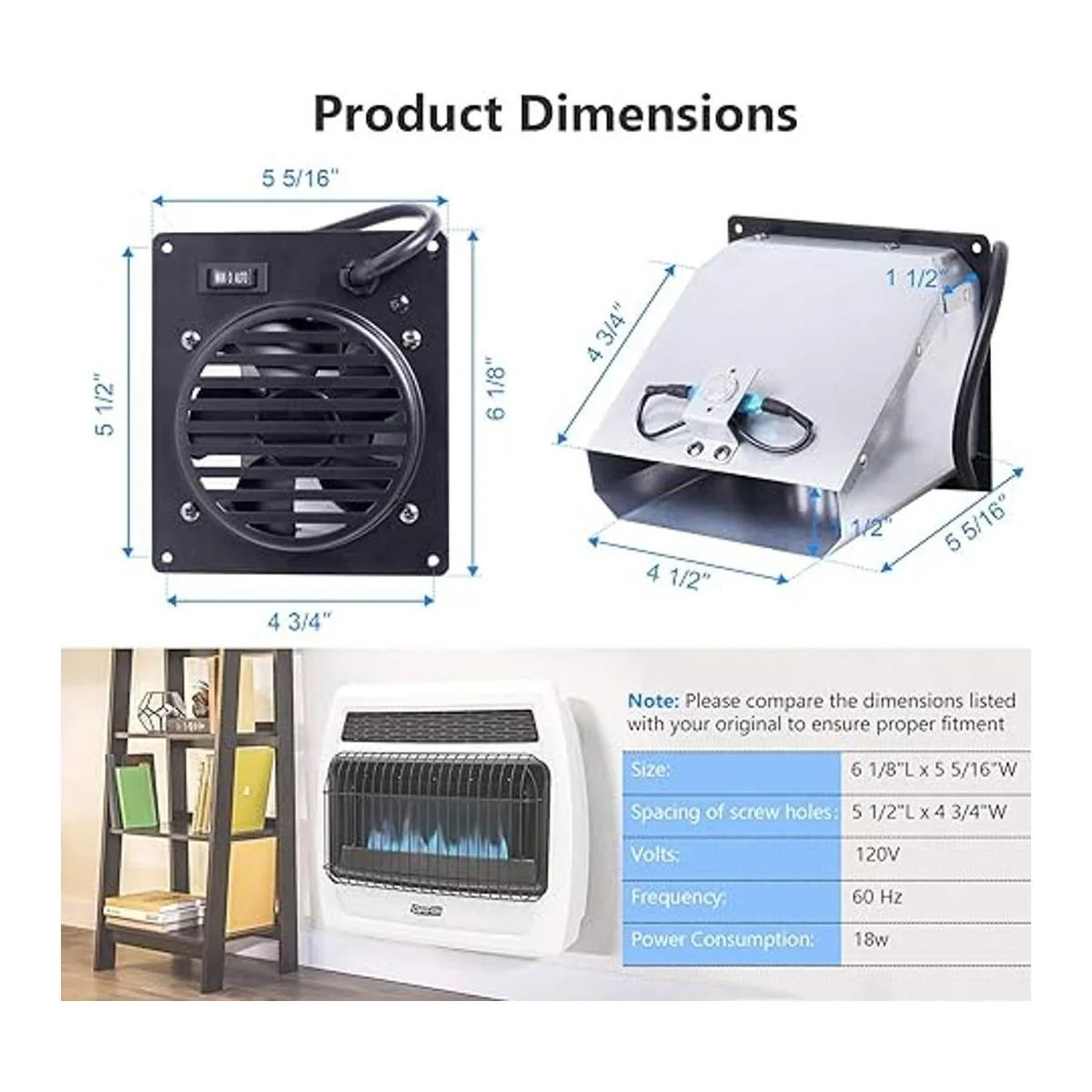 Especificaciones del ventilador Whf100: las dimensiones de este ventilador de ventilador DynaGlo son de aprox. 6 1/8 pulgadas de largo x 5 5/16 pulgadas de ancho. El espaciado de los agujeros de los tornillos es de aproximadamente 5 1/2 pulgadas de largo x 4 3/4 pulgadas de ancho. Voltios: 120 V, Frecuencia: 60 Hz, Consumo de energía: 18 W. Todos los componentes listados UL.