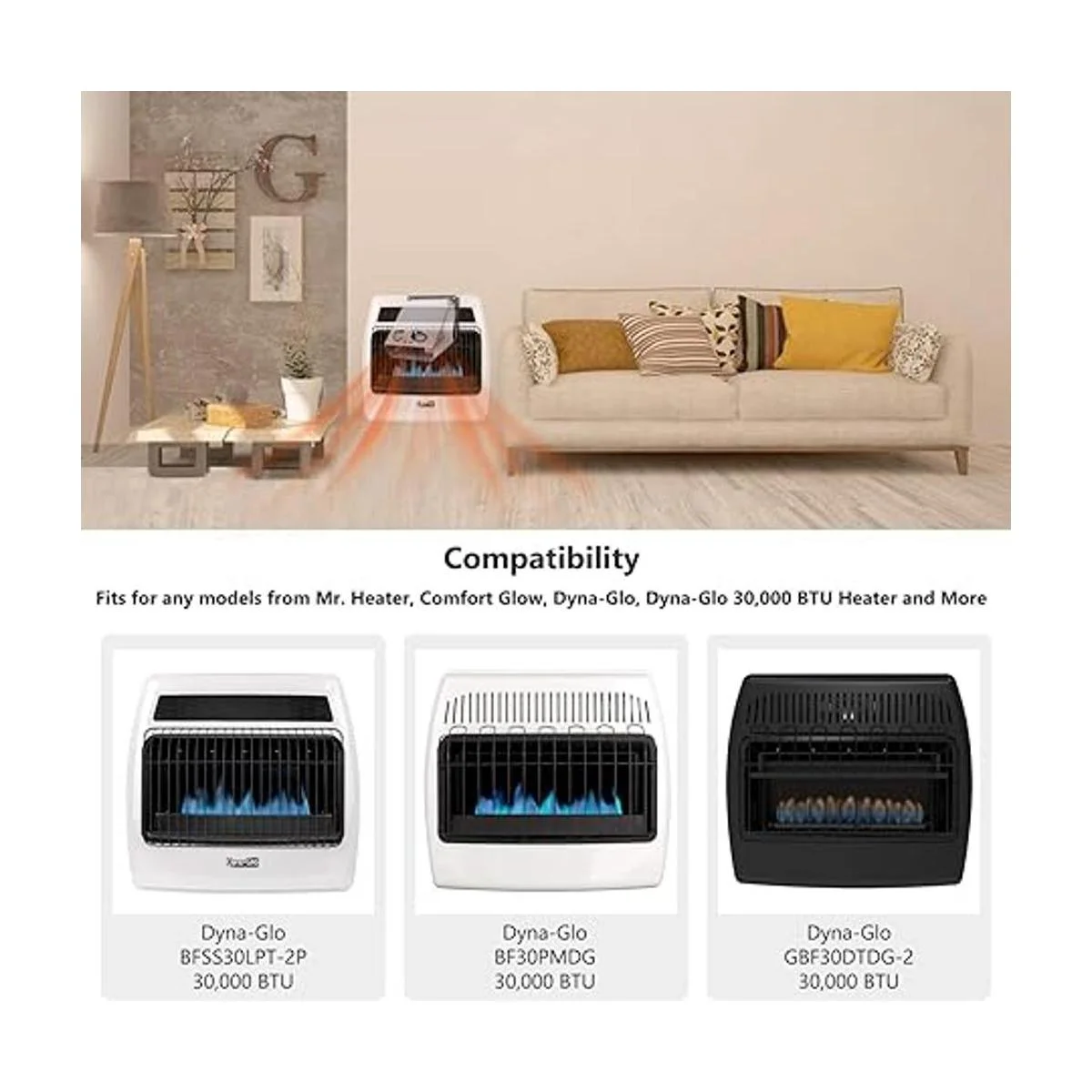 Modelos aplicables de calentadores sin ventilación: el ventilador whf100 se adapta a Mr. Heater, Comfort Glow, DynaGlo 30.000 BTU Heater. Se adapta a DynaGlo GBF30DTDG2 30,000 BTU, DynaGlo BF30NMDG4 30,000 BTU, DynaGlo BFSS30LPT2P 30,000 BTU, DynaGlo IRSS30NGT2N 3000 BTU, DynaGlo BF30PMD30PMD30PM. G 30,0 00 BTU y más.