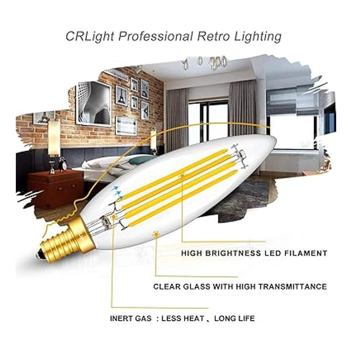 Alto brillo: bombillas LED de candelabro de alto brillo, chips LED alargados y de gran tamaño en filamentos, cada bombilla tiene 8 W de potencia con 800 lúmenes de flujo luminoso, tamaño completo es de diámetro de 1.4 in x altura de 4.9 in, voltaje de funcionamiento es de 110 V130 V, con protección de sobrecarga, protección contra cortocircuitos y protección de sobrecalentamiento
