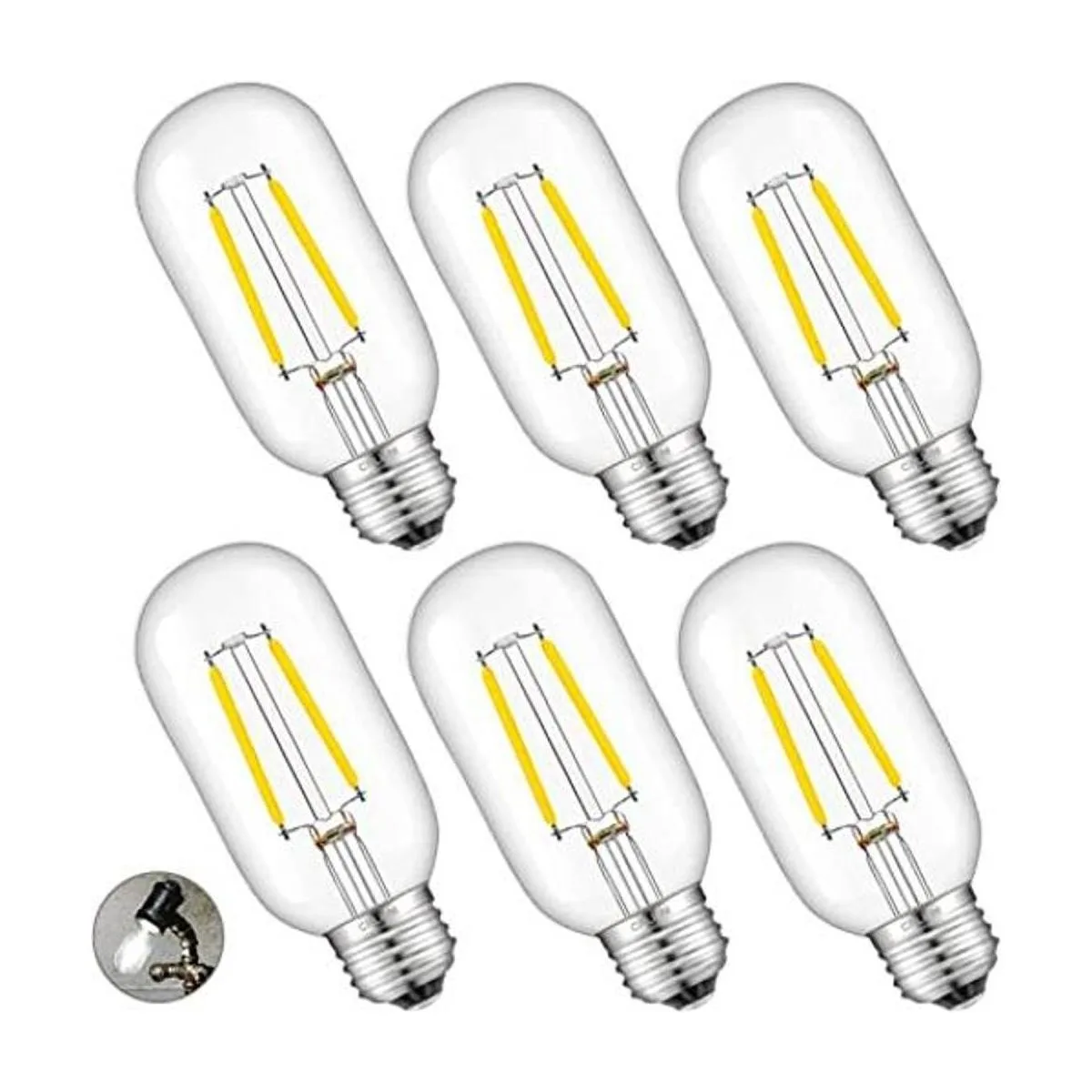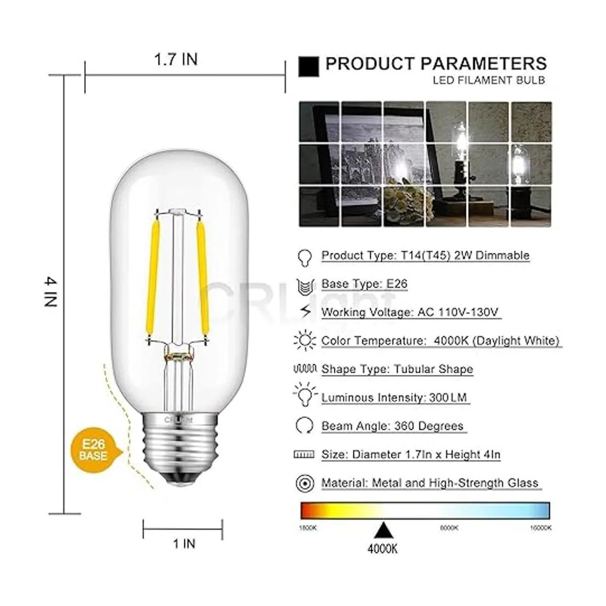 CRLight Bombilla tubular LED de 4000 K, luz diurna blanca, equivalente a 300 lúmenes, bombillas de filamento LED regulables de 2 W, base E26, bombillas tubulares de vidrio transparente Edison T45, paquete de 6