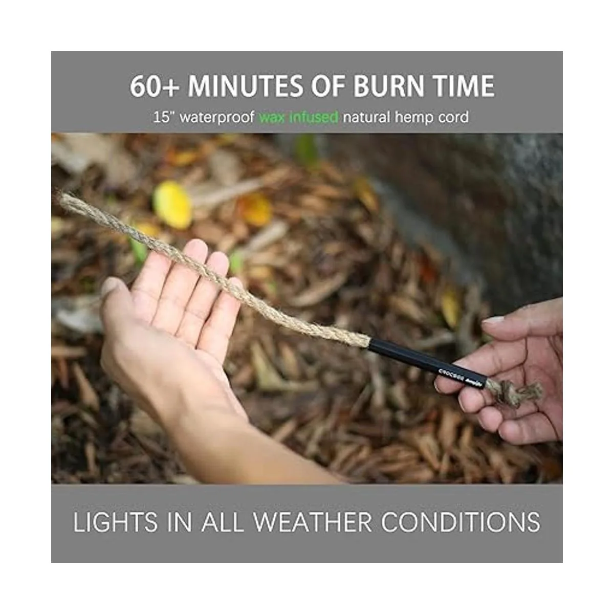 Cordón de cáñamo natural con infusión de cera impermeable que se enciende con una sola chispa. Funciona perfectamente con tu pedernal y acero, varillas de ferro o cualquier otro arrancador de fuego. El cordón de cáñamo natural patentado con infusión de cera funciona en todas las condiciones climáticas.