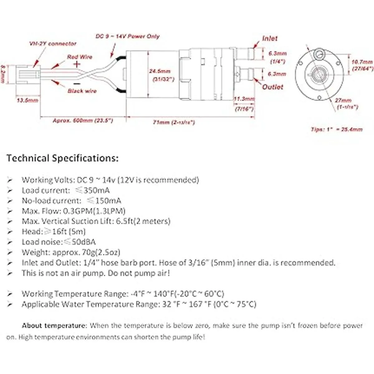 Entrada y salida: puerto de manguera de 1/4 pulgadas. Manguera de 0.197 in de diámetro interior. se recomienda. Aprox. Tamaño: 2.795 in x 1.063 in largo x diámetro máximo