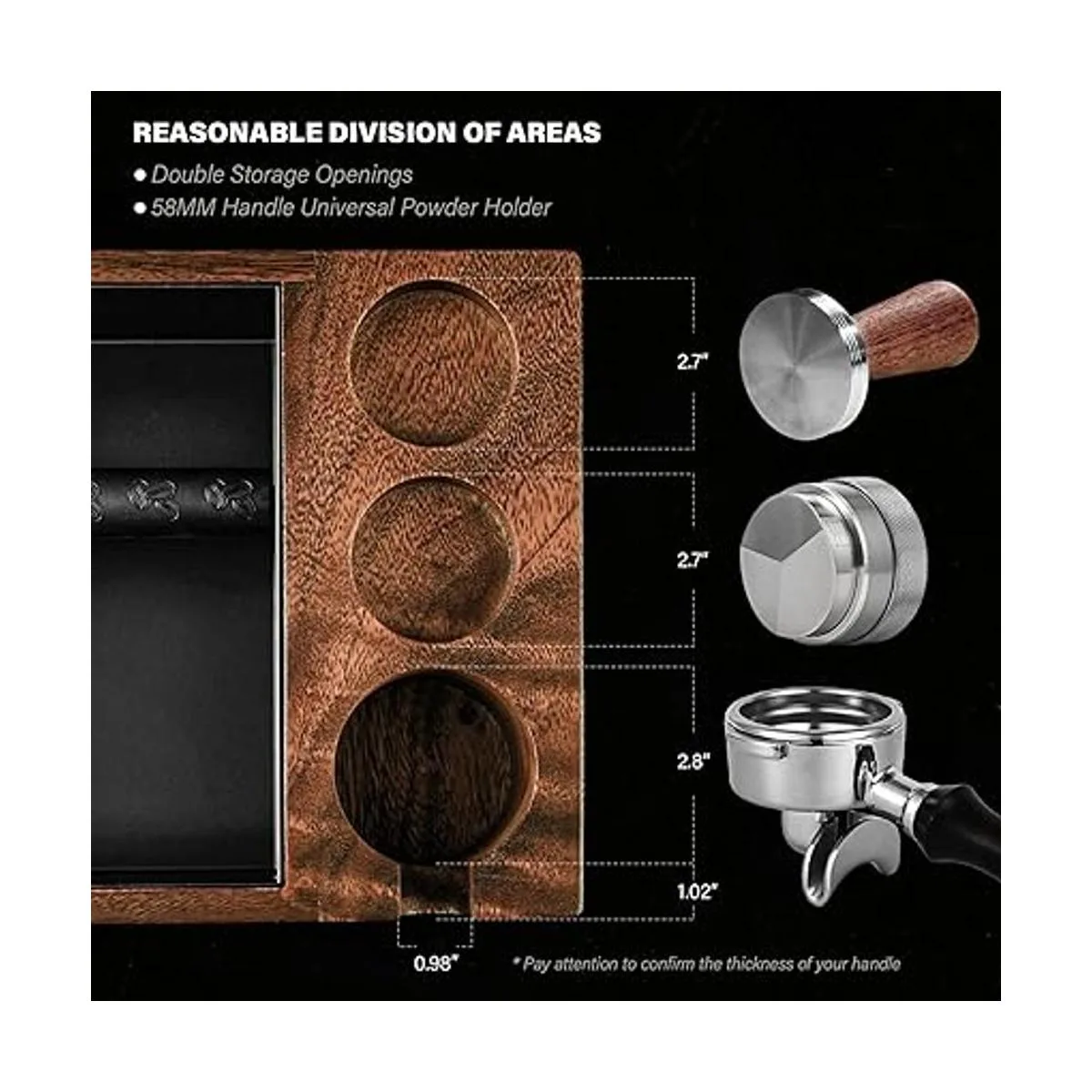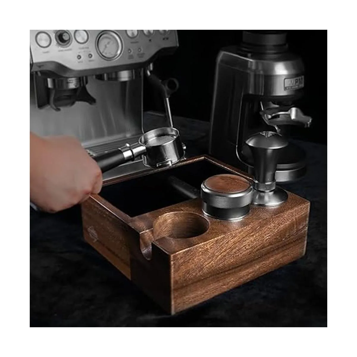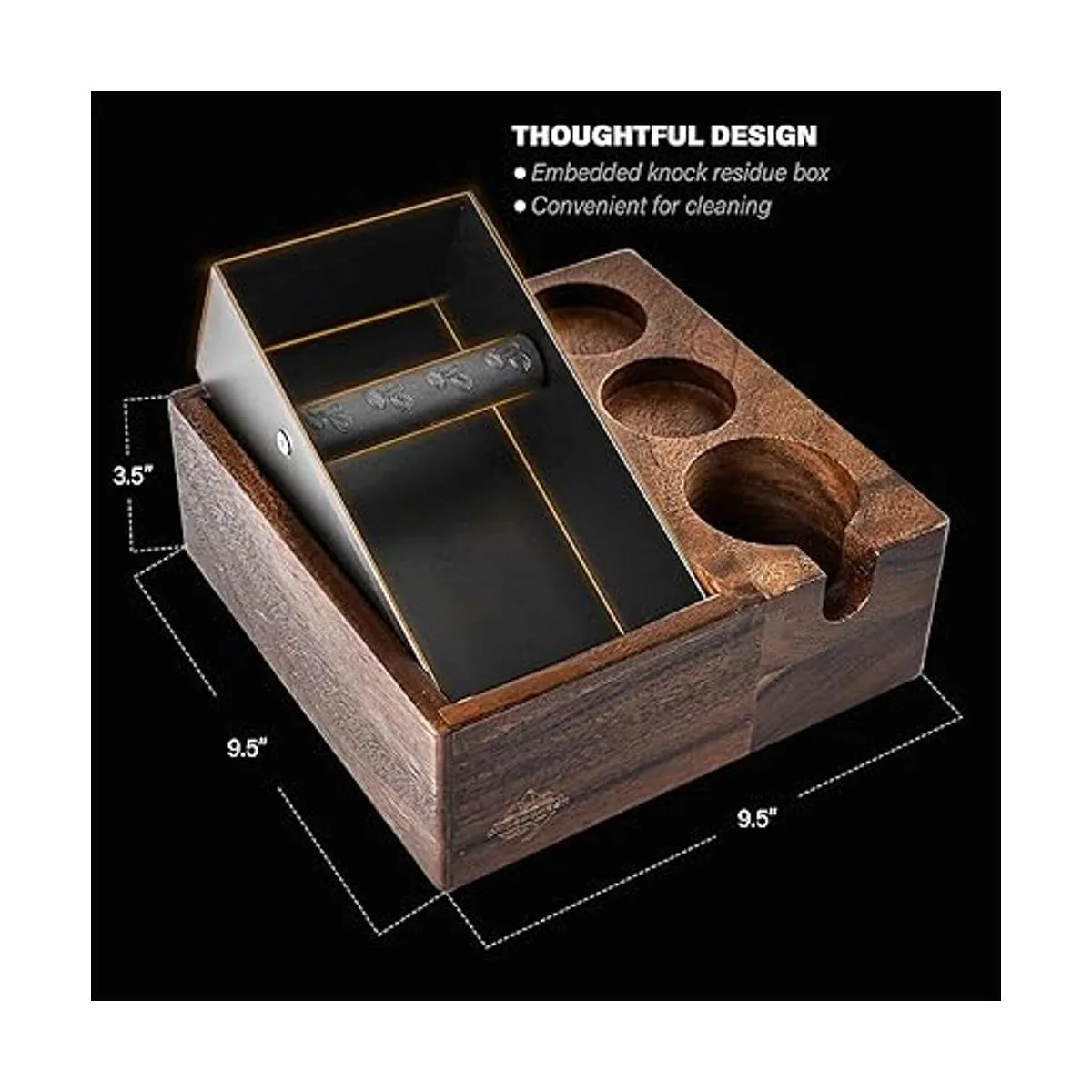 CrossCreek Caja organizadora de accesorios de café 4 en 1, 2.283 in, compatible con distribuidor de espresso de 2.283 in, portafiltros de café, soporte de apisonamiento y caja de golpe de 1,5 l, base de nogal