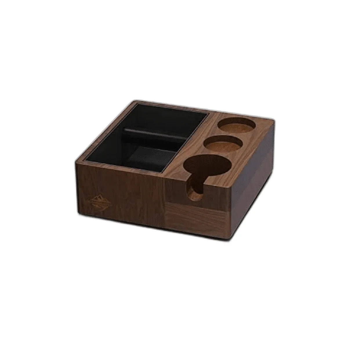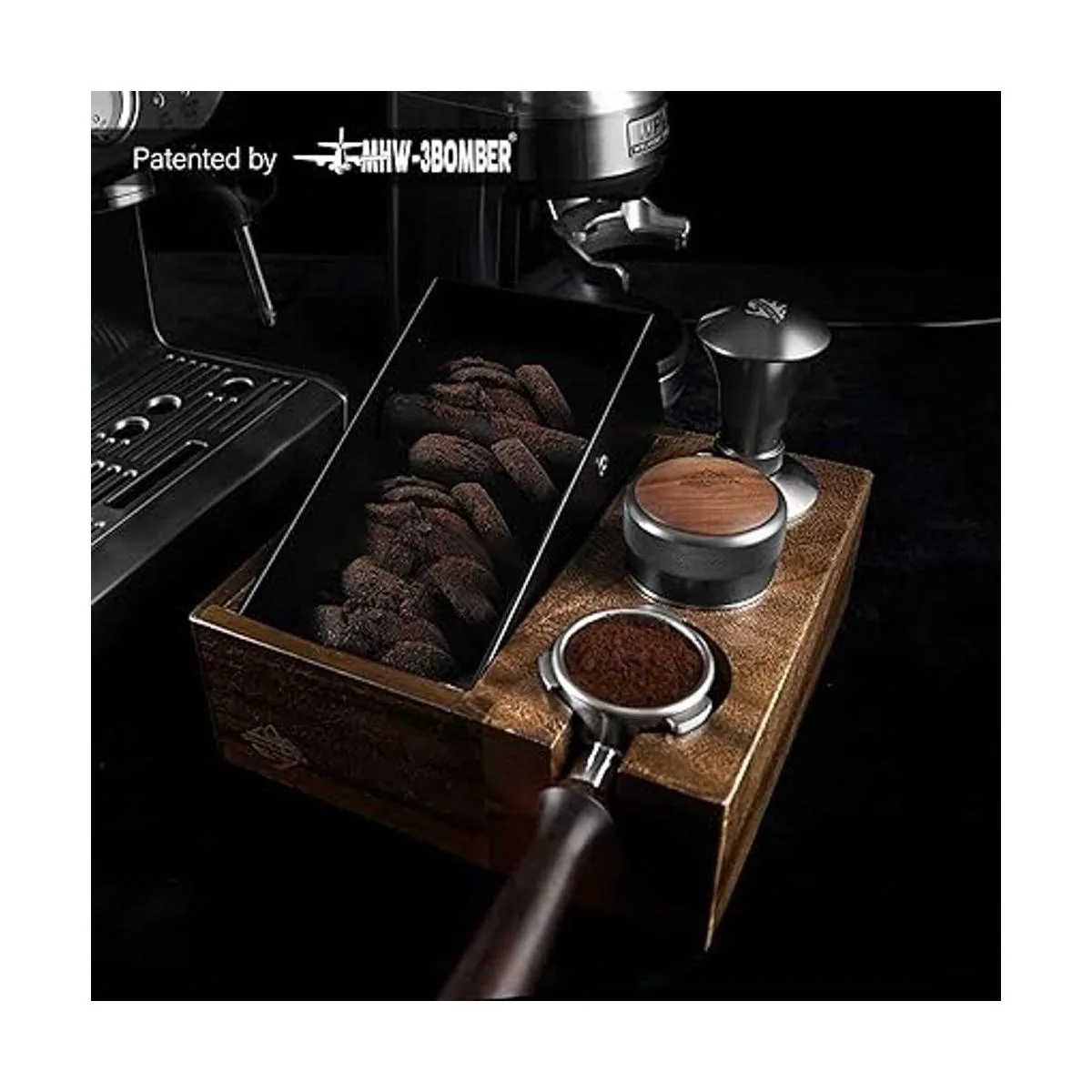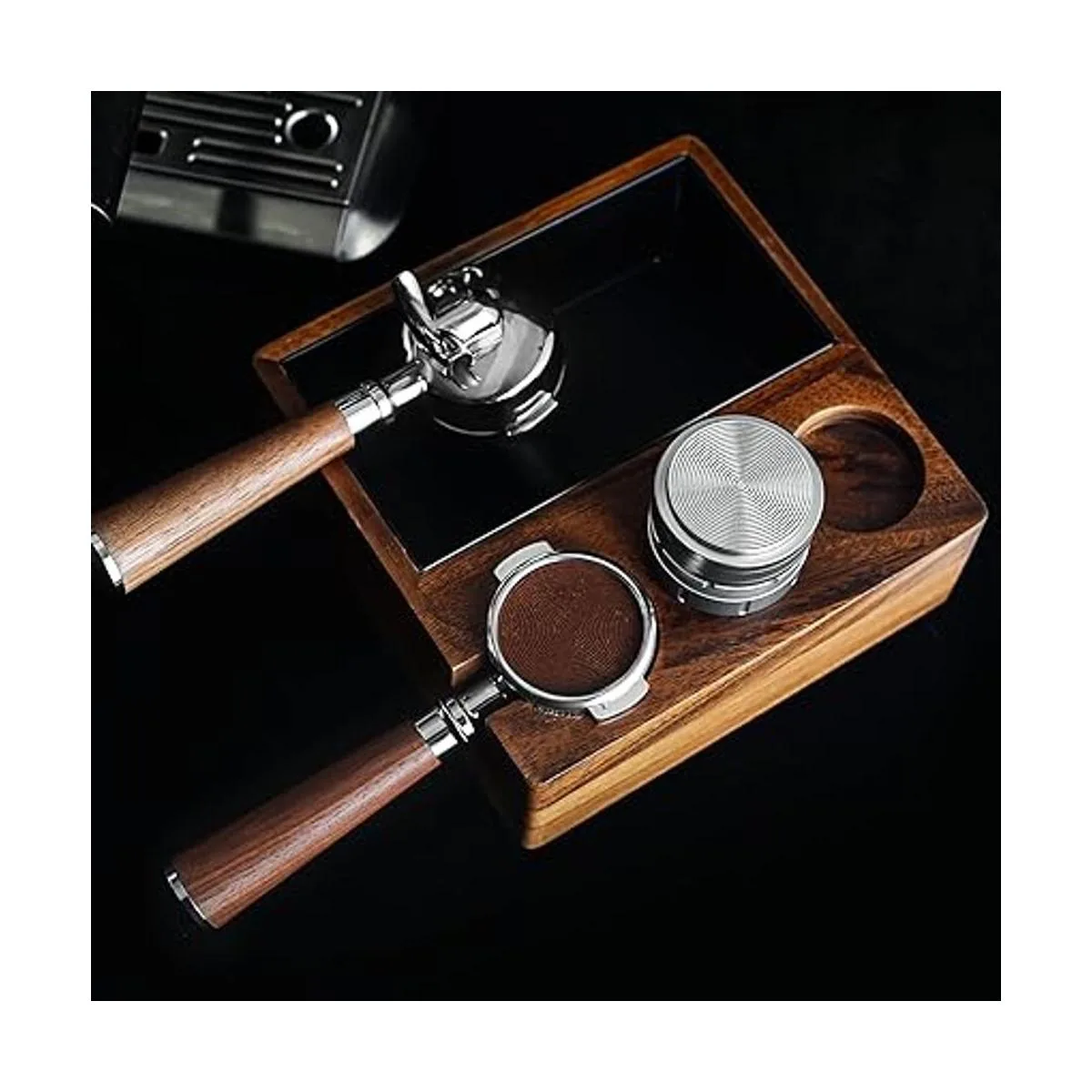 CrossCreek Caja organizadora de accesorios de café 4 en 1, 2.283 in, compatible con distribuidor de espresso de 2.283 in, portafiltros de café, soporte de apisonamiento y caja de golpe de 1,5 l, base de nogal
