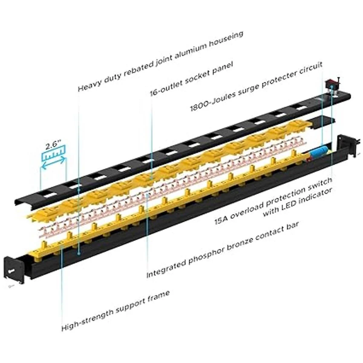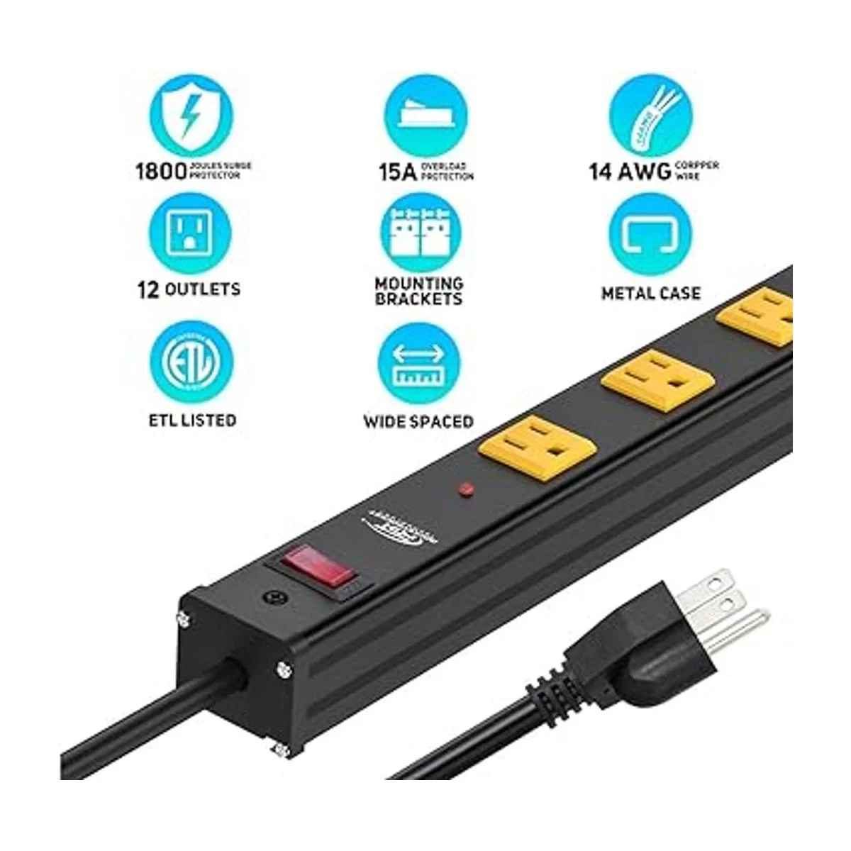 Características resistentes y certificación ETL: construcción resistente con carcasa de metal de aleación de aluminio gruesa, paneles de plástico ignífugos que hacen que la tira de alimentación sea lo suficientemente fuerte como para soportar golpes y calor. Certificado ETL USCA, clasificación eléctrica de 15 amperios, 125 voltios, 1875 vatios