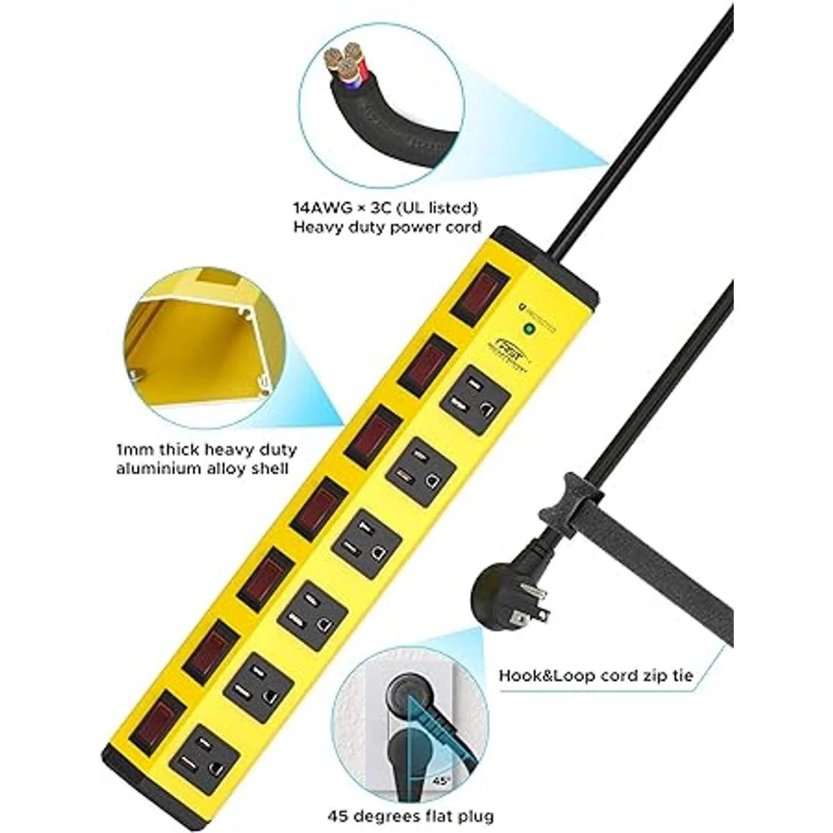Diseño humanizado: cable de extensión con certificación UL de 6 pies con cierre de velcro, enchufe plano en ángulo de 45 que mantiene el cable cerca de la pared; cabe fácilmente en espacios reducidos y detrás de muebles como estanterías o sofás. 2 ranuras para colgar fáciles de instalar en la pared o banco de trabajo. Todas estas características mejoran la experiencia del usuario en detalle y te ofrecen más comodidad.