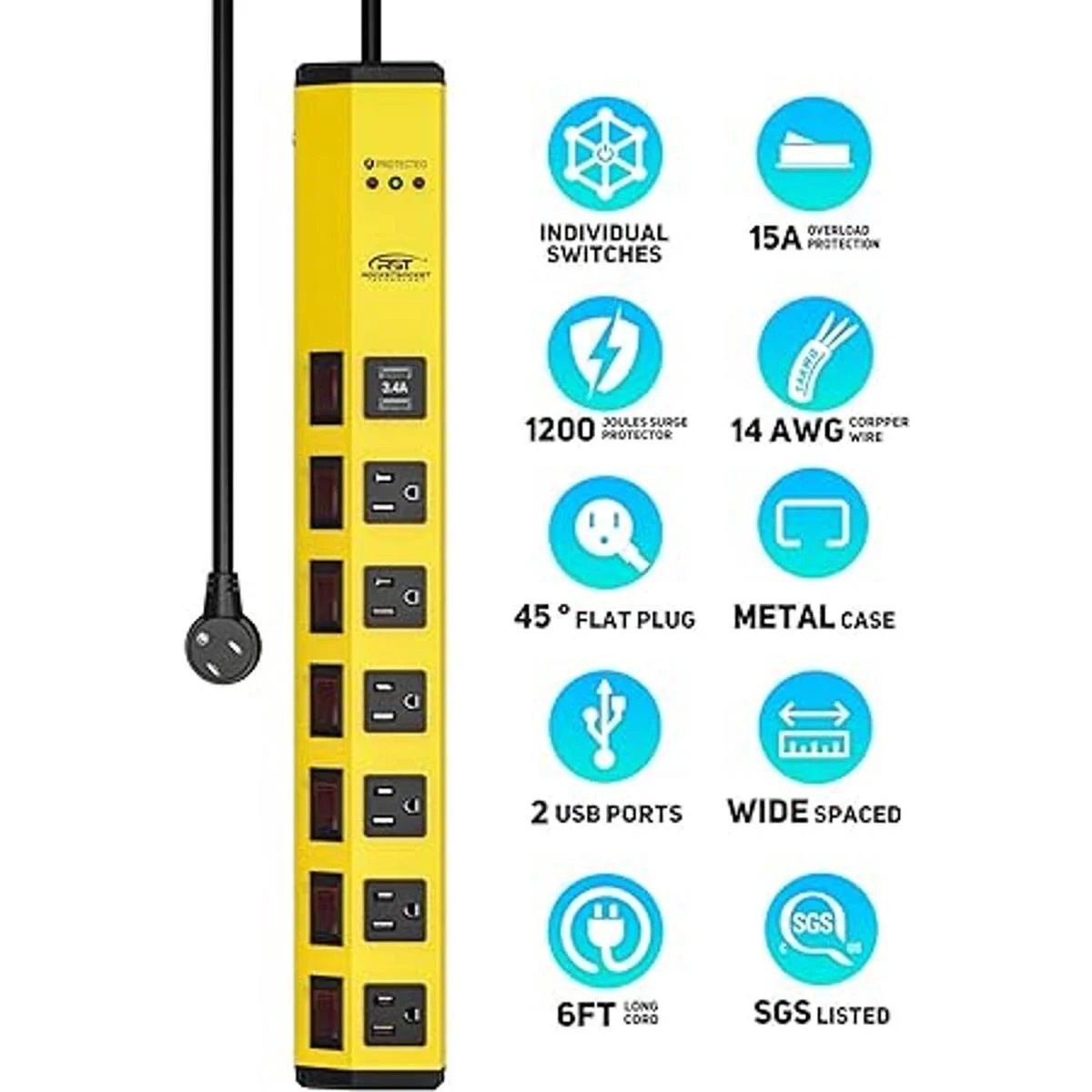 CRST Regleta de alimentación resistente de 6 tomas con USB, interruptores individuales y enchufe plano, protector de sobretensiones industrial de metal de 1200 julios, disyuntor de 15 A, cable de extensión de 6 pies y 14 AWG con lazo de fijación
