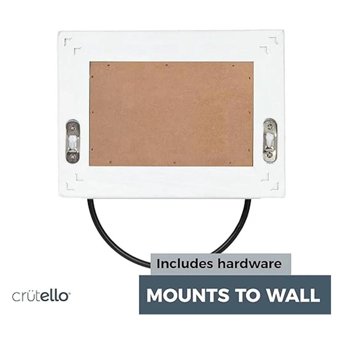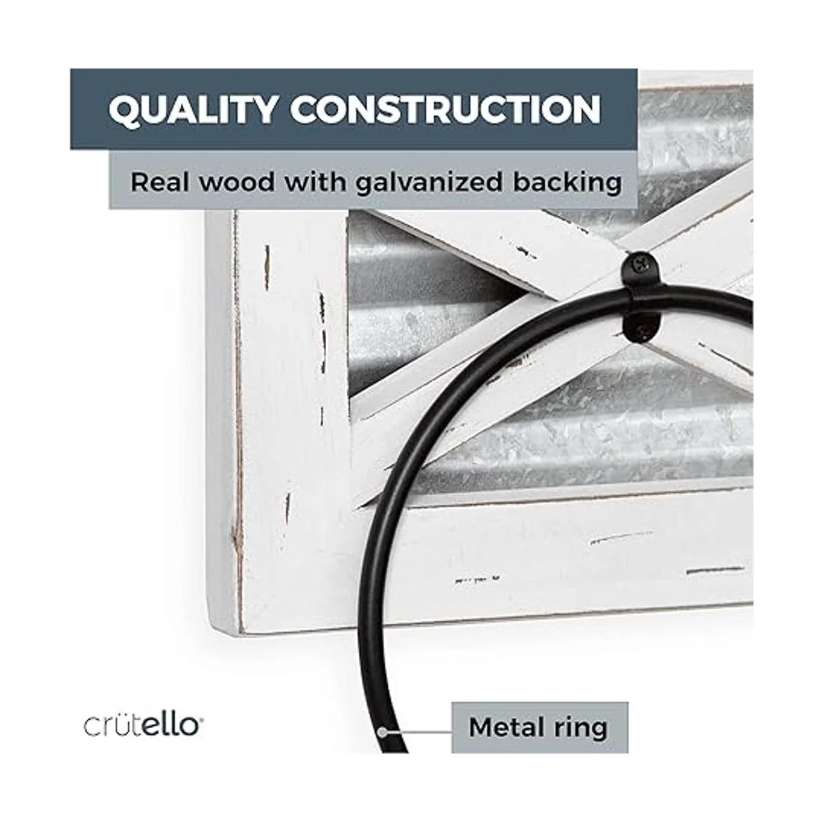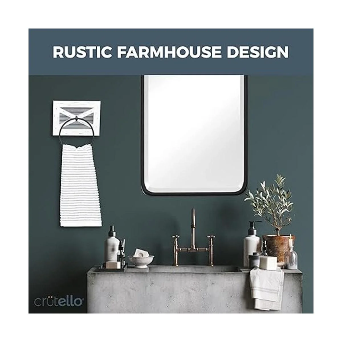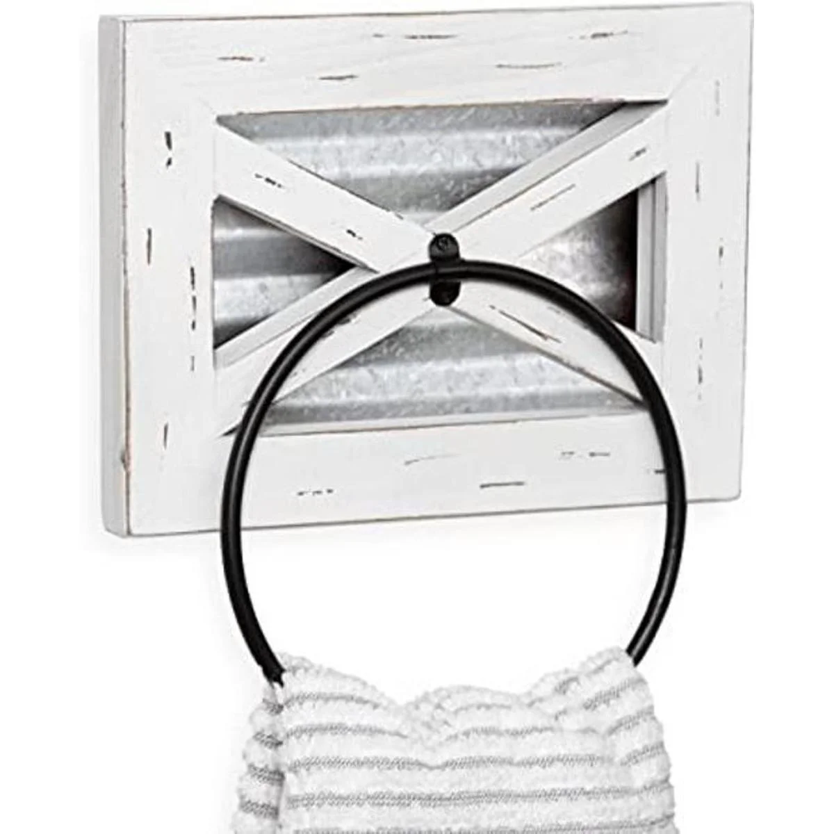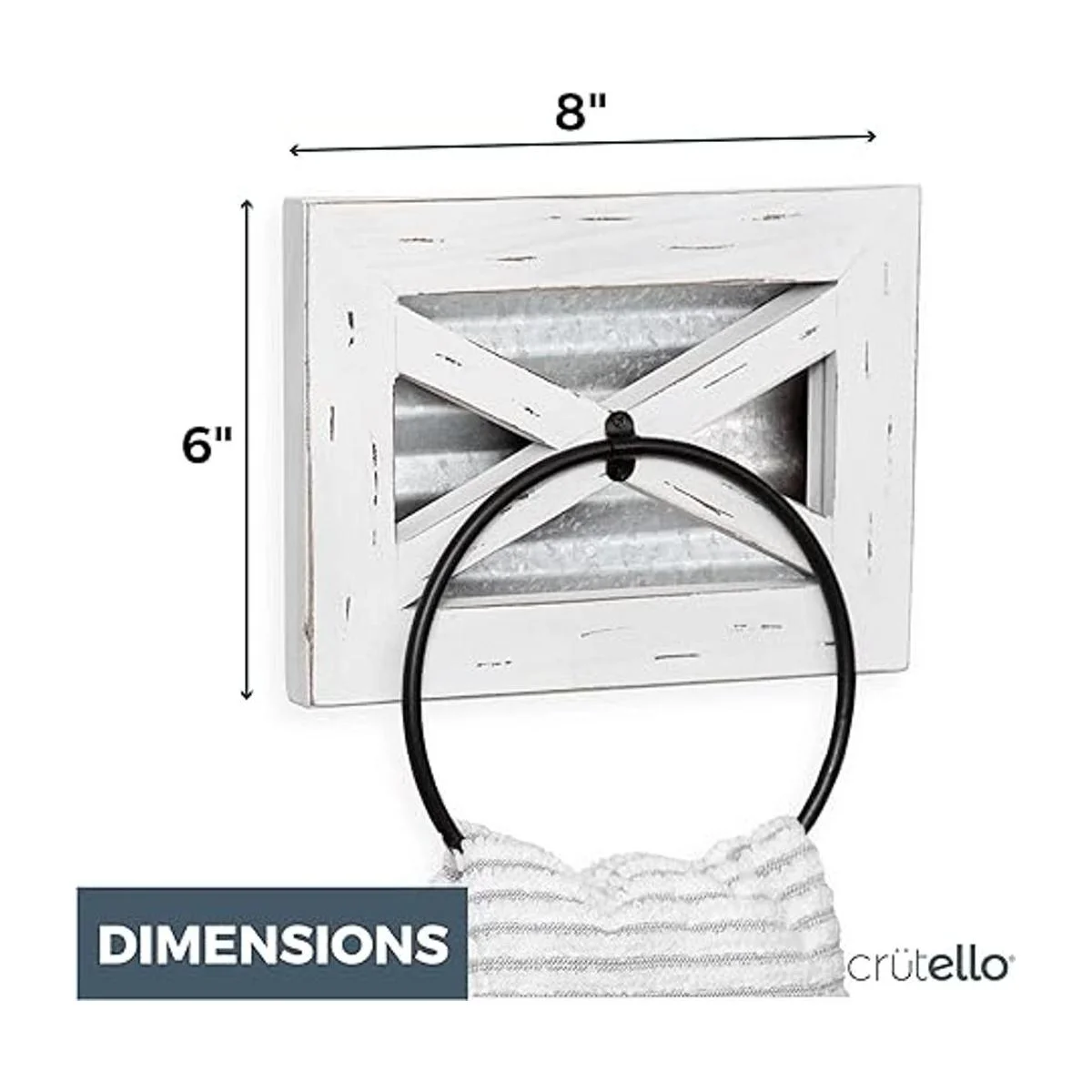 Crutello Toallero de mano rústico para baño con respaldo galvanizado, soporte para toallas de mano de baño montado en la pared, madera blanca y anillo de metal negro, decoración de granja