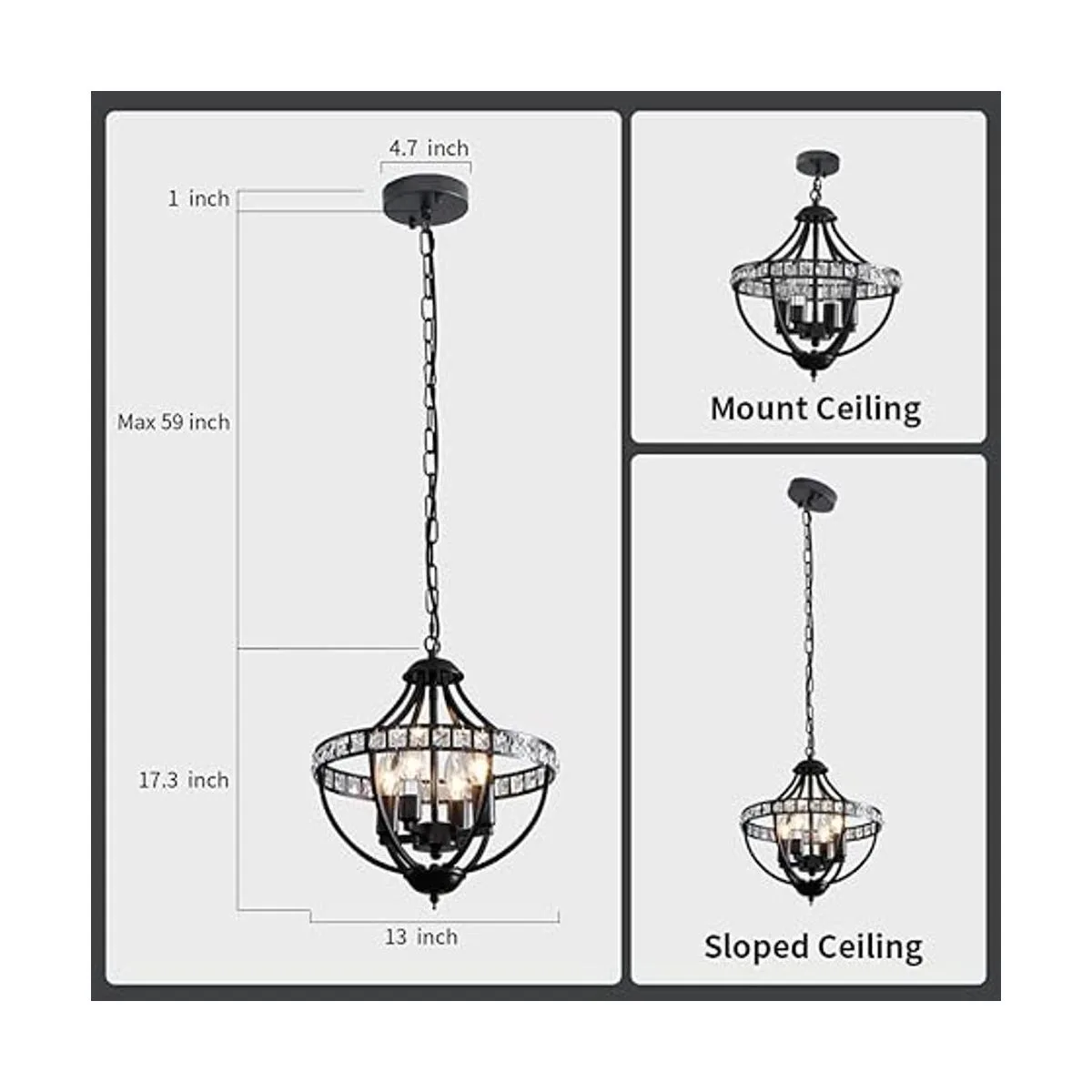 Height AdjustableThis black crystal chandelier is adaptable for sloped, hanging and flat ceiling. Fixture Dimensions: 17.3 high x 13 wide. Comes with a pendant chain 59 inches, it is an adjustable farmhouse chandelier that you can adjust the hanging height according to different home decors and locations.