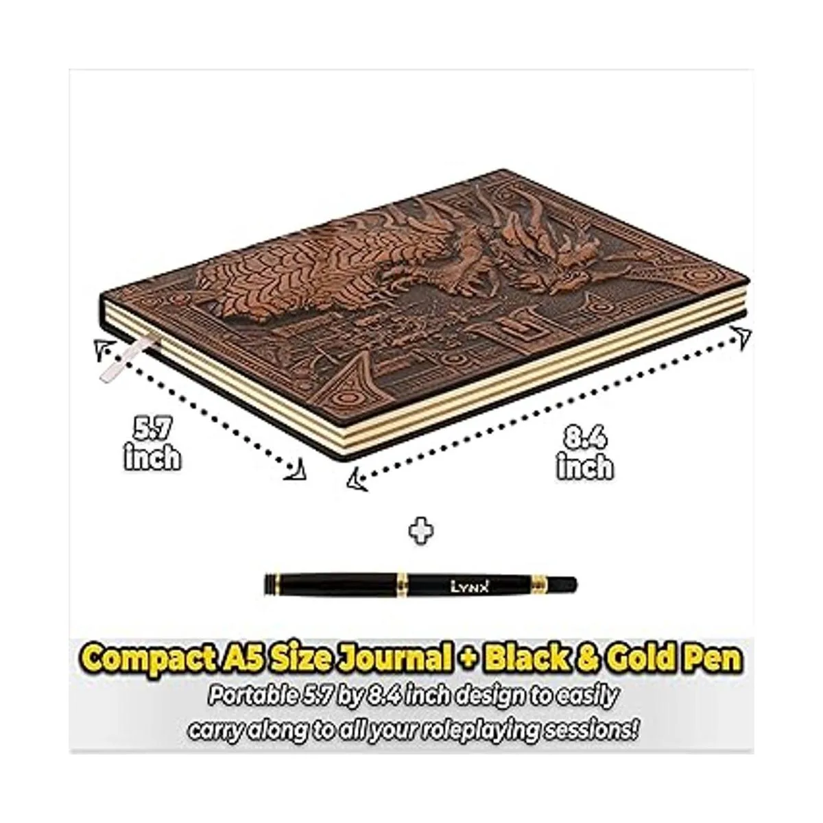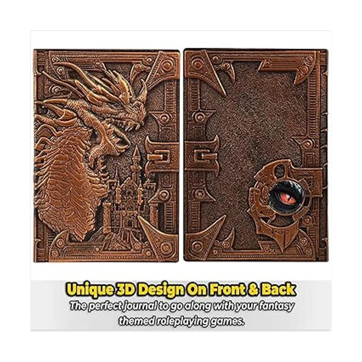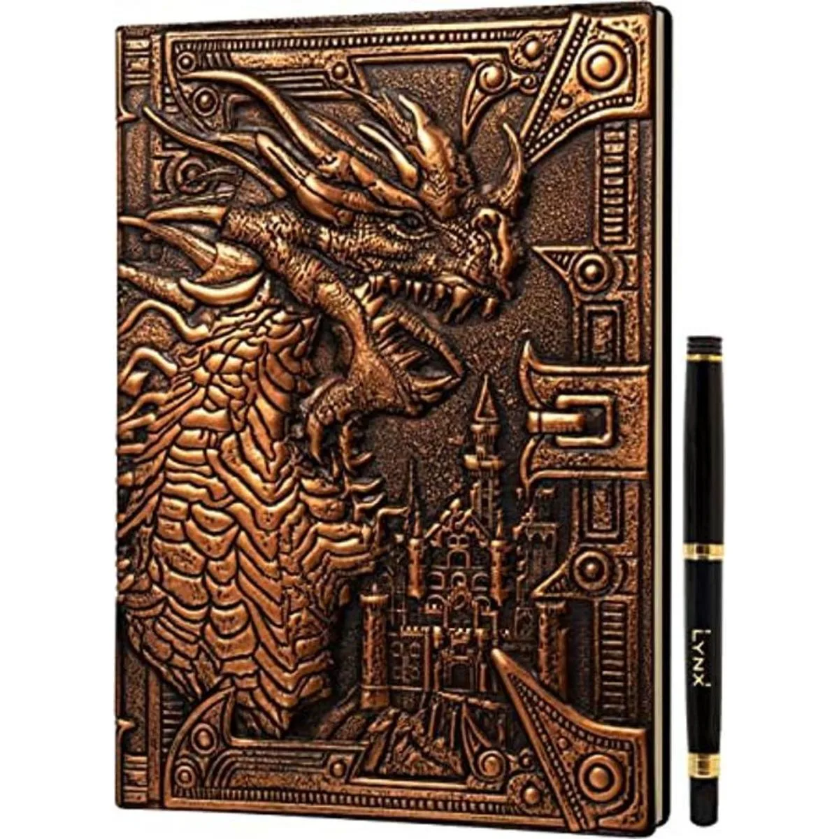 Cuaderno DND diario, libro único de 200 páginas con cubierta de cuero sintético en relieve de dragón de bronce 3D con bolígrafo, ideal para mazmorras y dragones, DD. Grandes accesorios de RPG, regalo de fantasía nerd para DM y jugadores, hombres o mujeres.