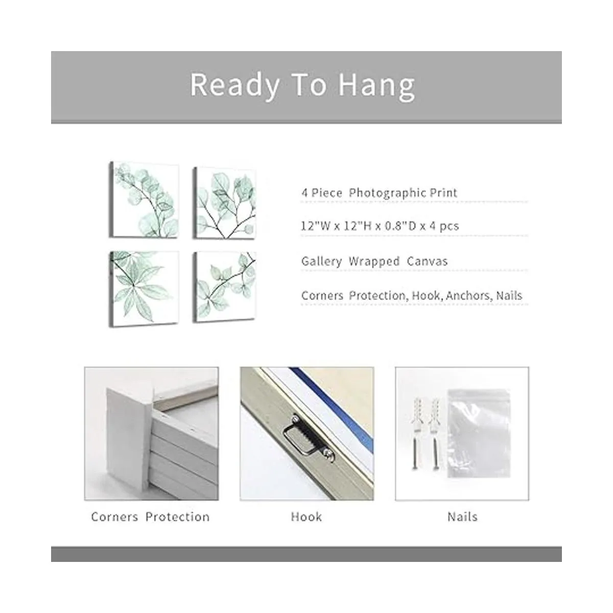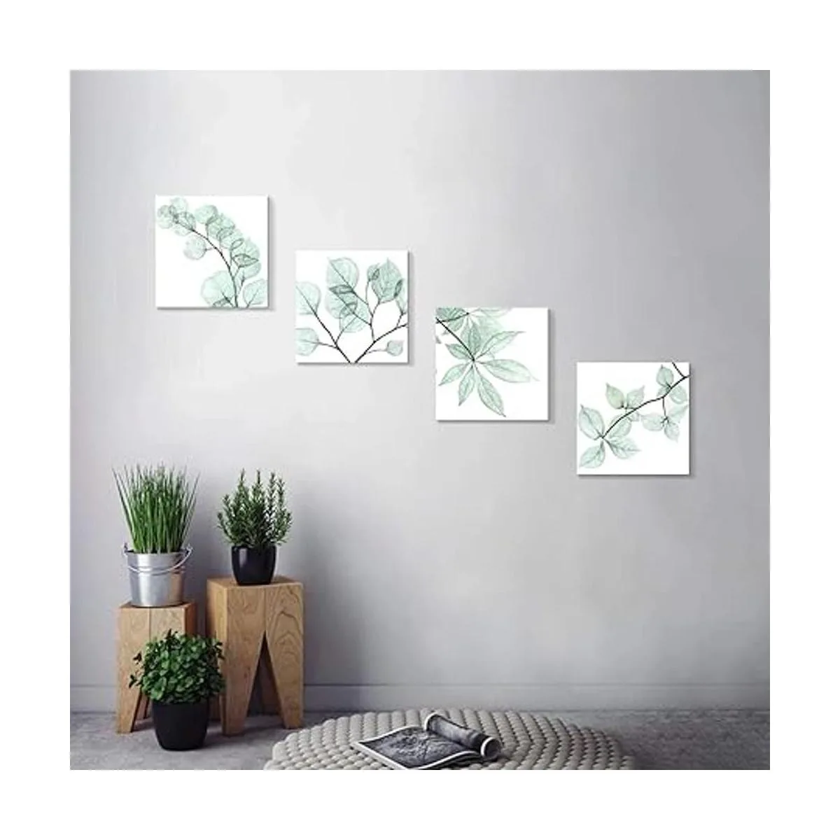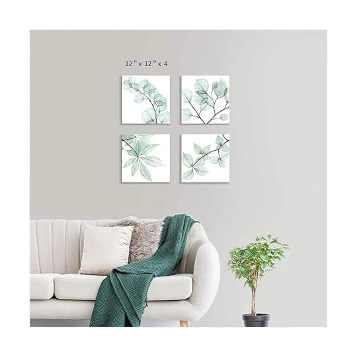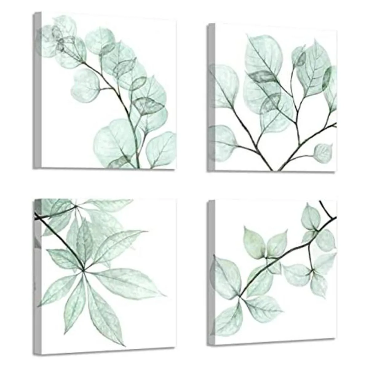 Cuadros florales de arte de hojas naturales impresión gráfica de ramita sobre lienzo para pared de baño 12.0 in de ancho x 12.0 in de alto x 4 unidades, multitamaño