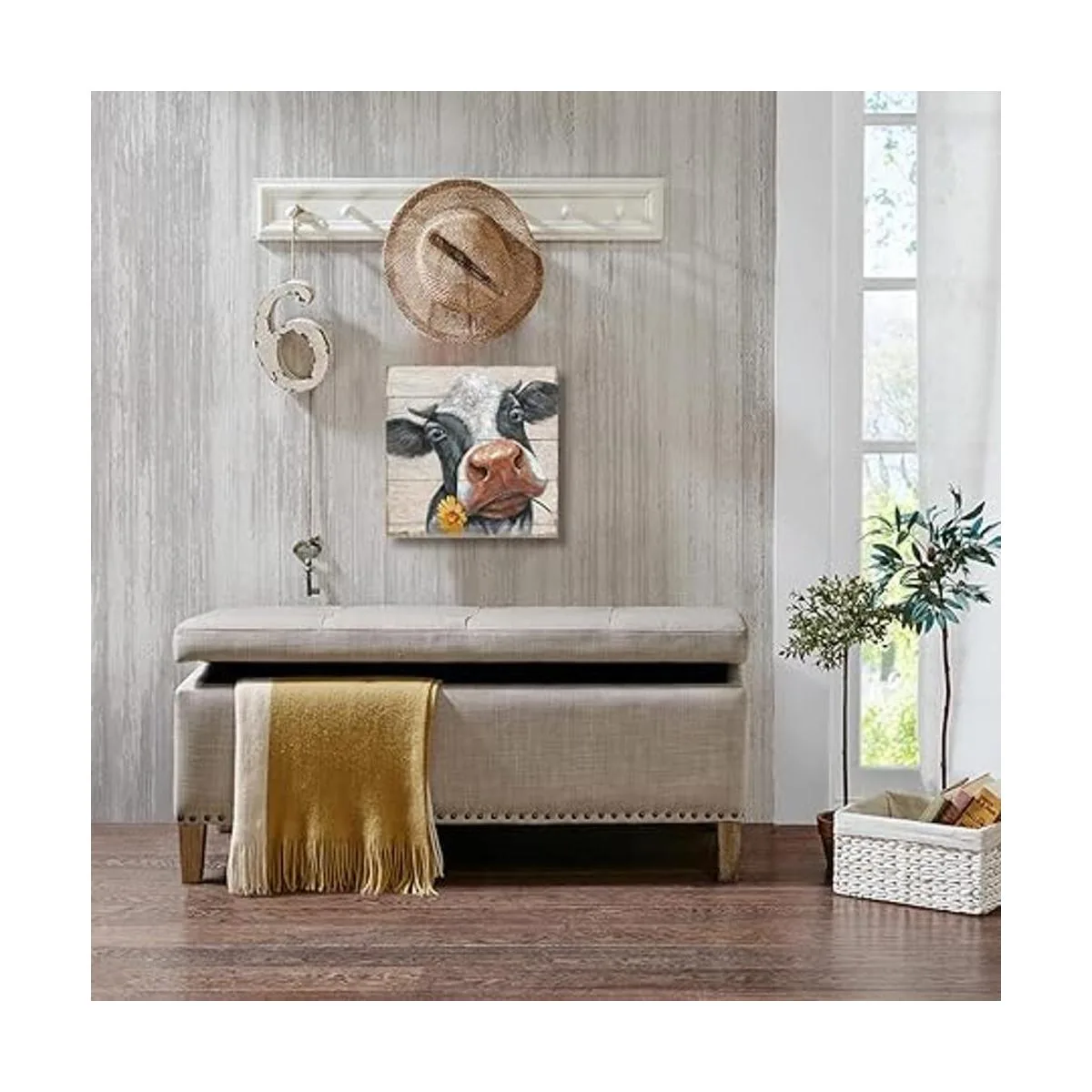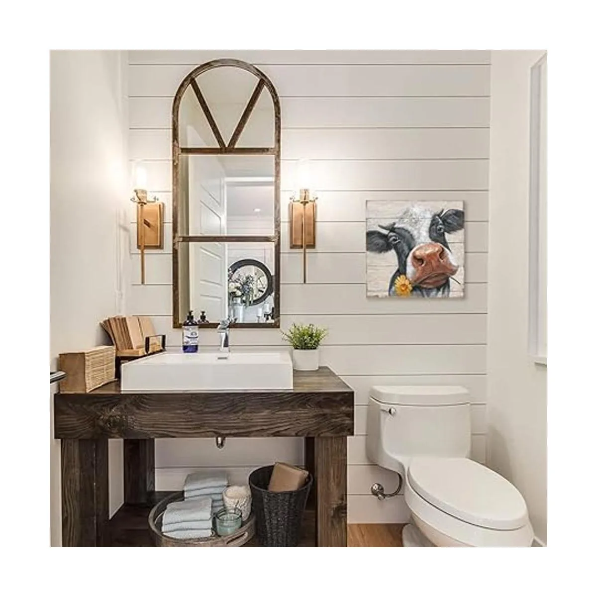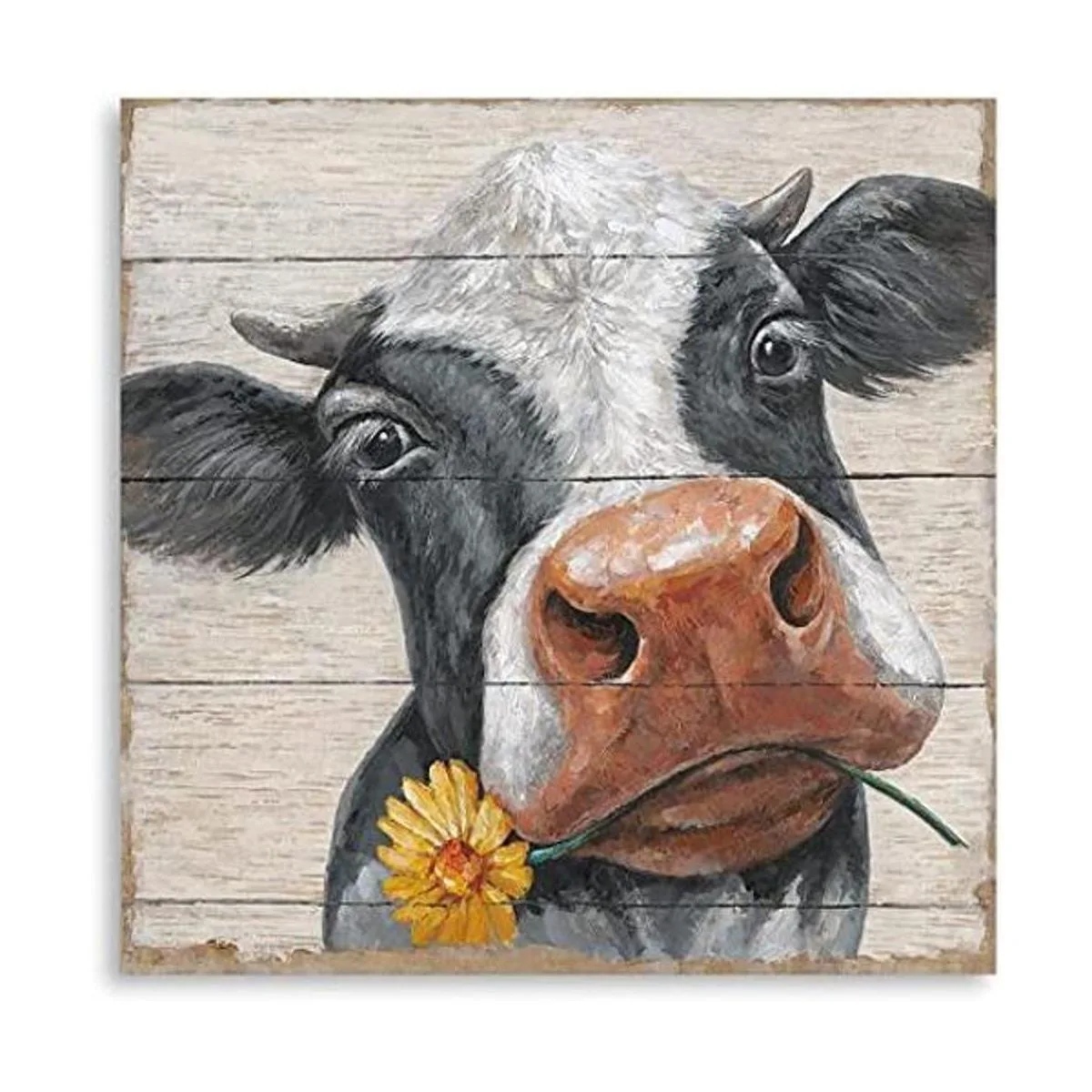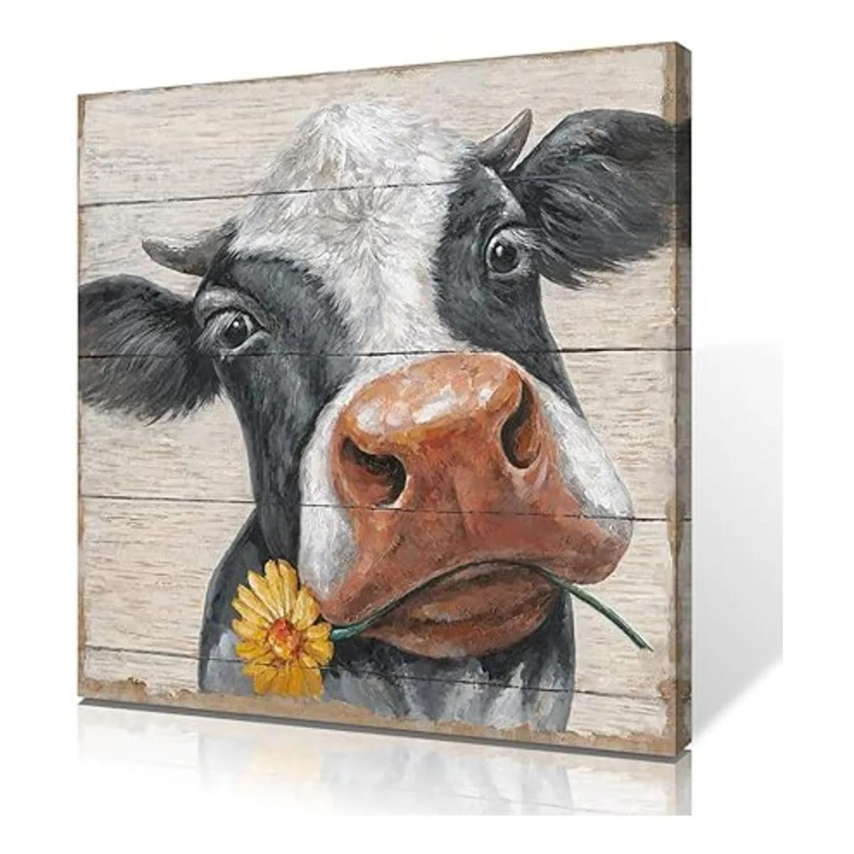 Cuadros rústicos de vaca para decoración de pared lienzo de vaca de granja, arte de pared de vaca de animales de granja con girasol en panel de madera, decoración de habitación para el hogar, cocina, baño, dormitorio, guardería, enmarcado, 14 x 14 pulgadas
