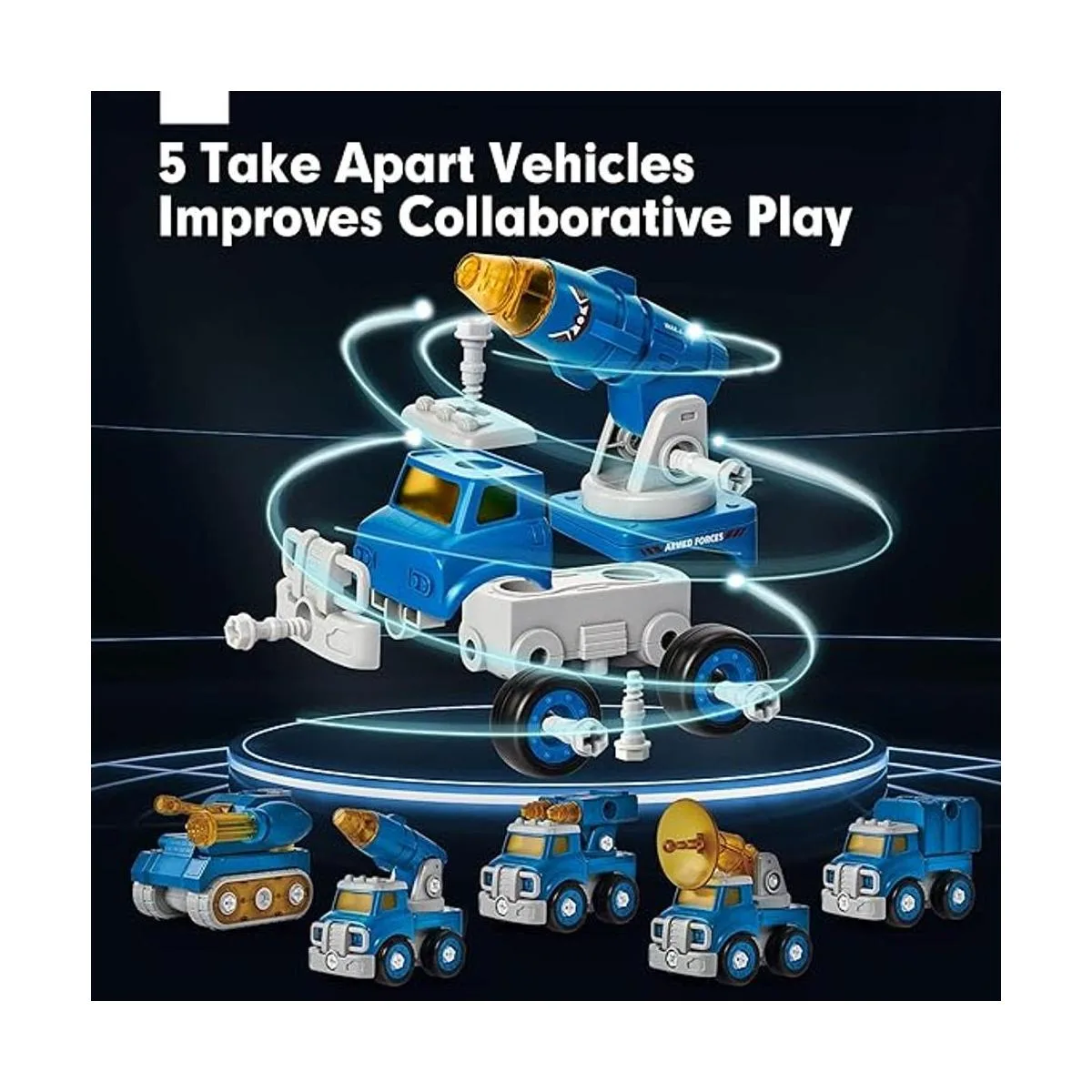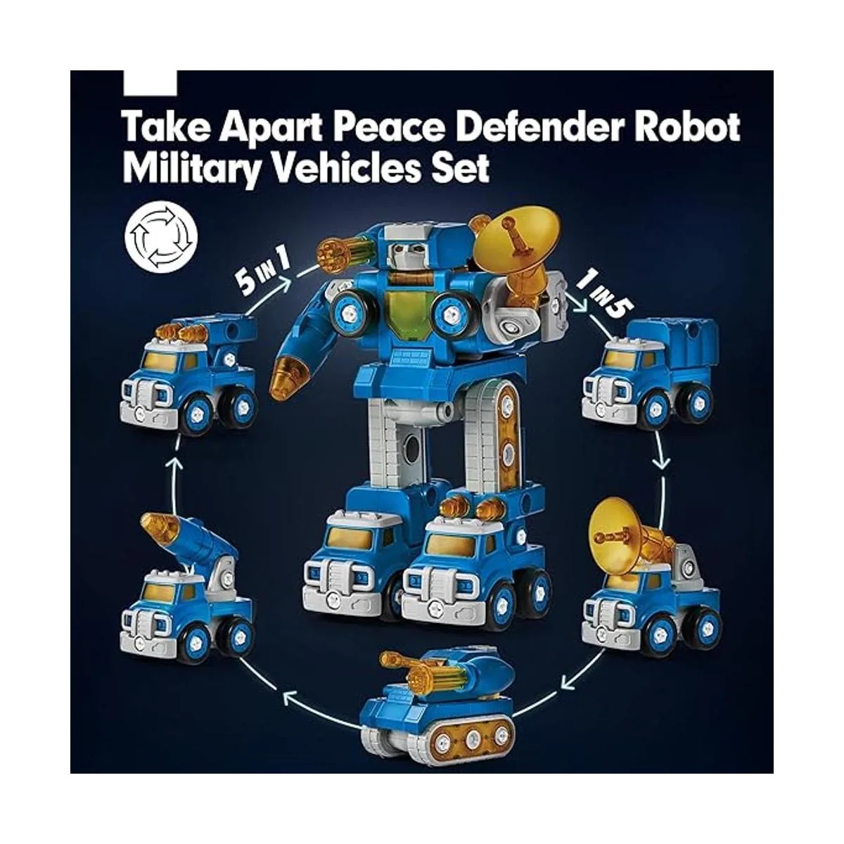 5 vehículos militares en 1 robot de defensa de la paz Hay 5 vehículos en la caja y vienen con instrucciones fáciles de seguir idioma español no garantizado. El juego de construcción de robot consta de 5 vehículos desmontables, todos los coches se pueden desmontar completamente en piezas de coche y transformar en un gran robot o montar en cinco coches separados. Estos juguetes para niños fomentan el juego solo y en colaboración permitiendo a los niños y niñas promover el trabajo en equipo y la paciencia. Es un regalo de Navidad ideal para niños.