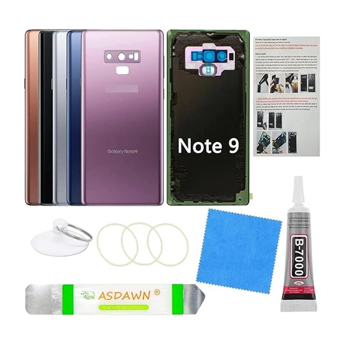Cubierta trasera de vidrio para Galaxy Note 9 con lente de cámara preinstalada, manual de instalación, todo el adhesivo, herramientas de reparación para Samsung Galaxy Note 9 SMN960, todos los portadores morado lavanda