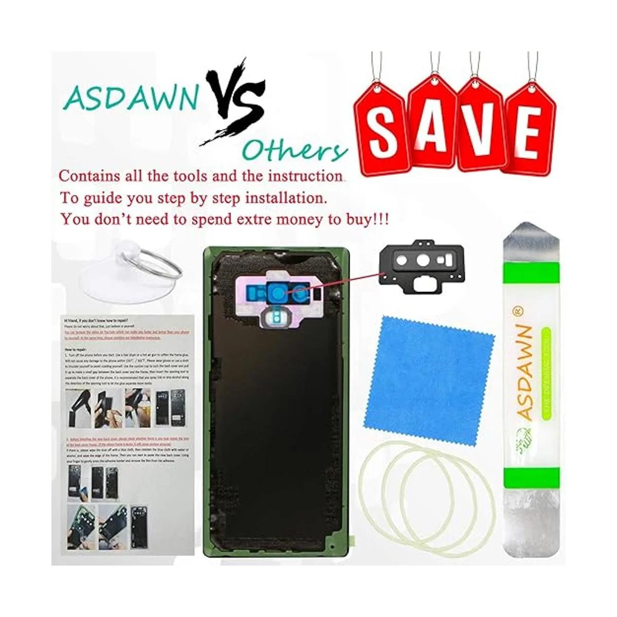Fácil instalación y ahorra dinero Reemplazo de ajuste 100 perfecto. La carcasa de la puerta trasera de cristal para Galaxy Note 9 viene con lente de marco de cámara preinstalada, adhesivo preinstalado y kit de herramientas de reparación. El manual de instrucciones paso a paso está incluido para que puedas instalarlo fácilmente. Disfruta de la diversión del bricolaje. Ahorra dinero comprando nuevas piezas de reparación de puertas de carcasa de vidrio para Galaxy Note 9 y haciendo la reparación en casa Restaura el dispositivo de nuevo a nuevo