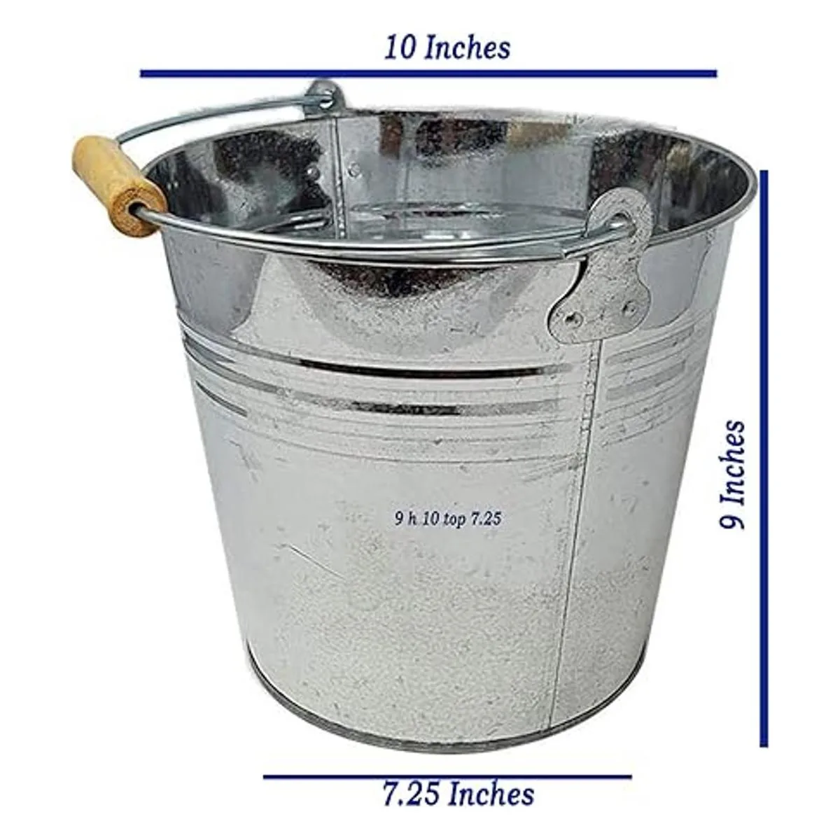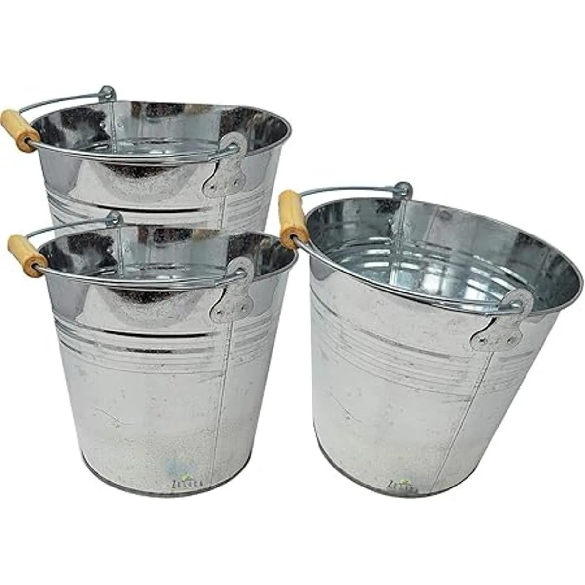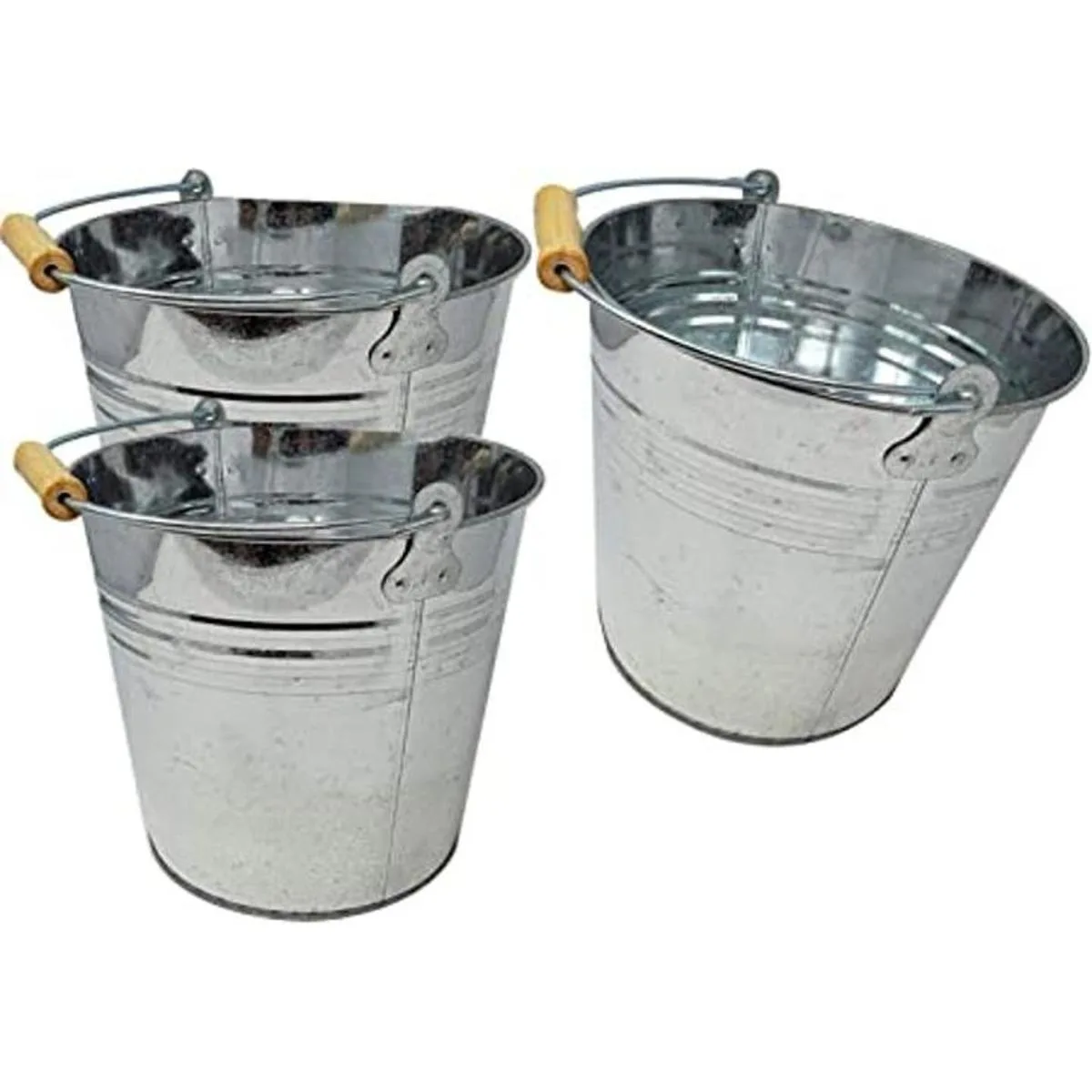 Cubo de metal grande de 2 galones paquete de 3 latas plateadas con mango de madera para cestas de regalos, hielo, cerveza o caramelos, 10 pulgadas superior x 9 pulgadas de alto x 7.5 pulgadas de fondo