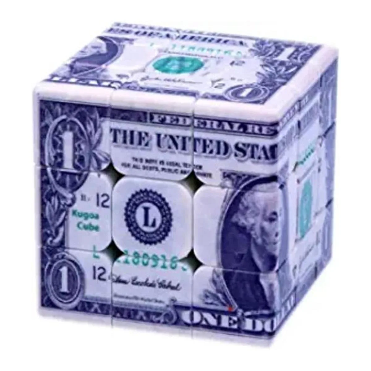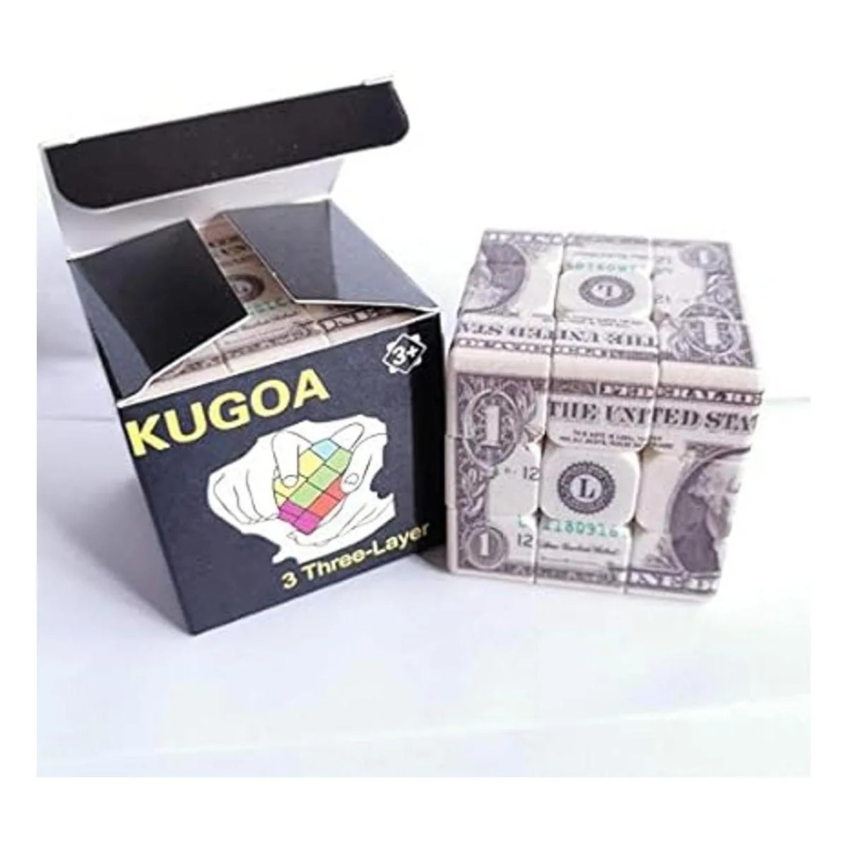Este cubo de 3 x 3 x 3 está diseñado con un patrón de fachada de un dólar USD. El cubo adopta el mismo color con un patrón de dólar, que hace que el rompecabezas sea más novedoso e interesante. El cubo con la impresión Kugoa Cubic, por favor, presta atención a este logotipo, el otro es falsificado
