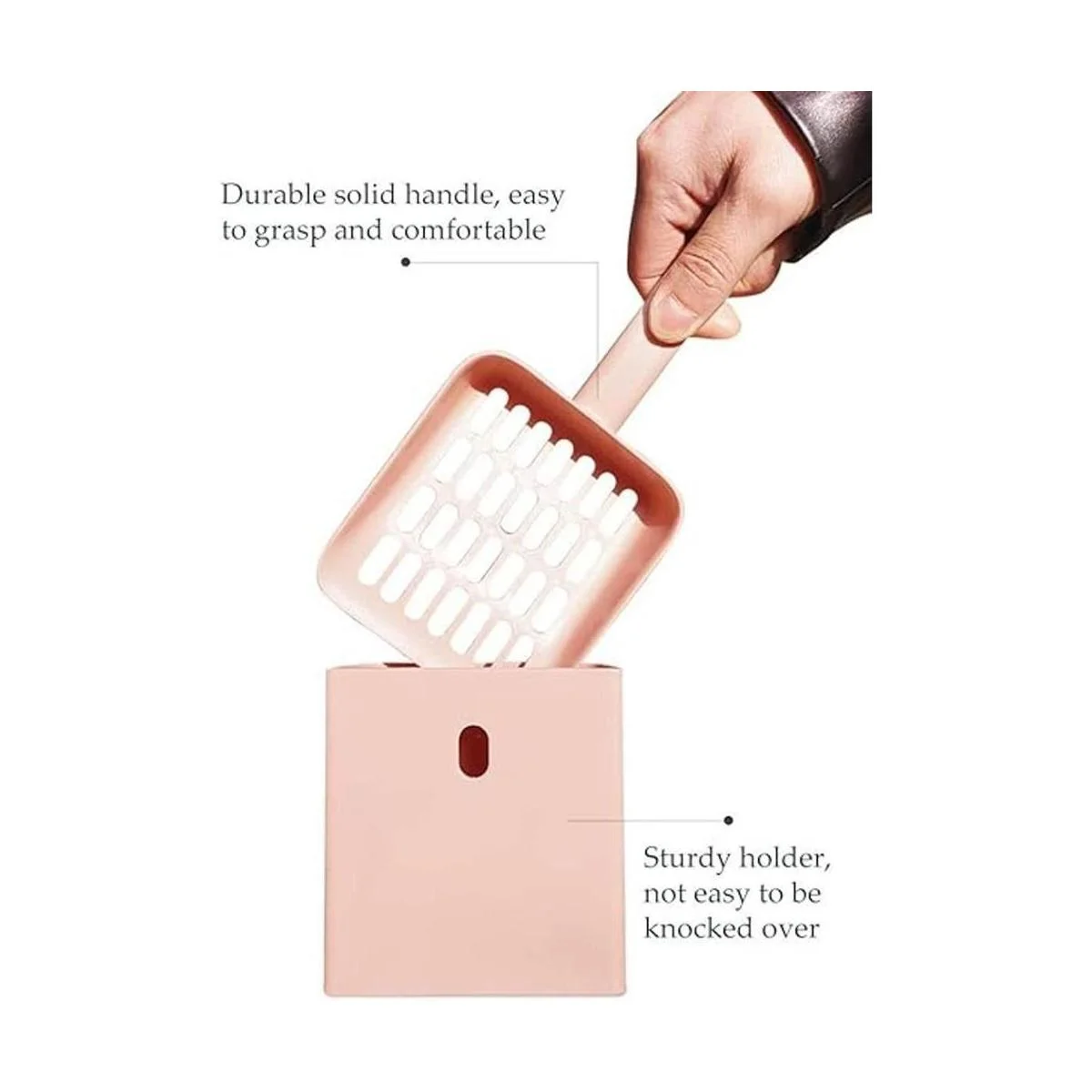 Duradero y de alta calidad: la cuchara de arena para gatos con soporte está hecha de ABS de alta calidad. El mango sólido es fácil y cómodo de agarrar. El soporte de la base es resistente, no es fácil de golpear.