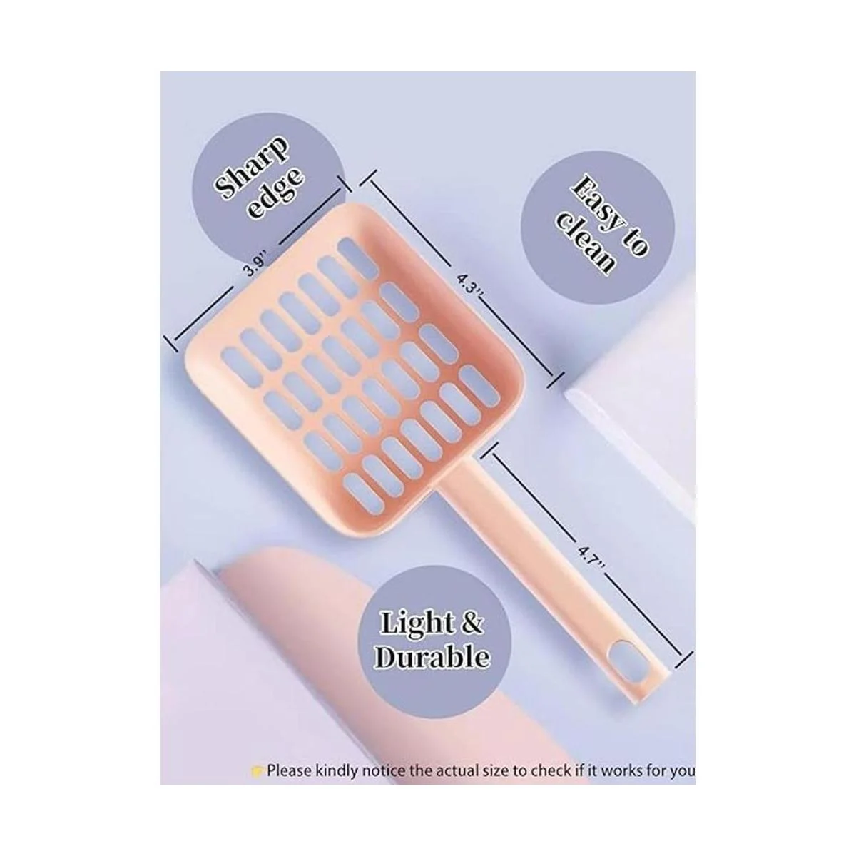Fácil de usar: el cubo de arena puede llegar a la parte inferior de la bandeja y girar alrededor de las esquinas fácilmente. Los agujeros son de buen tamaño para que la arena limpia caiga mientras reduce el desperdicio. Funciona mejor que otros cuando se enfrenta al agua y al orinar gato.