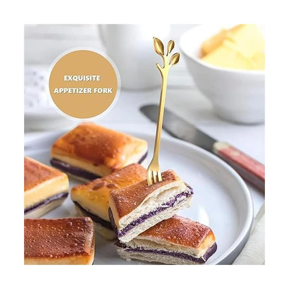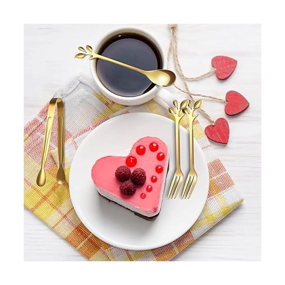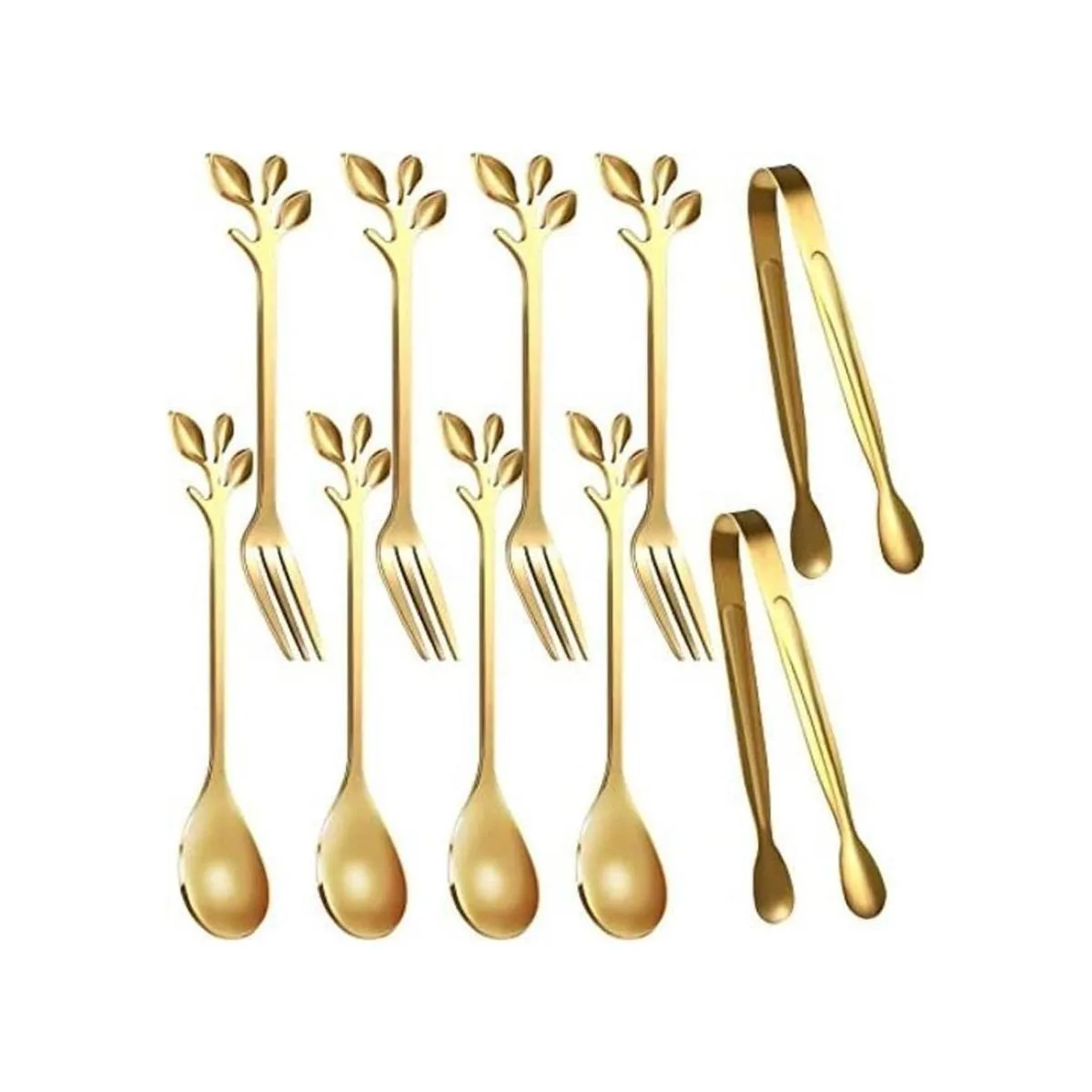 Cucharas de café de hoja, mini pinzas para servir y tenedores de aperitivos, pinzas de acero inoxidable, cucharas de postre, tenedores de metal para postres y café té 10, dorado