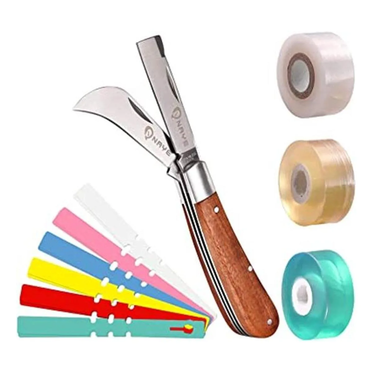 Cuchillo de injerto de jardín con cintas de injerto y etiquetas de plantas, hojas curvadas de acero sin estacado para podar injerto de árboles frutales, reparación de árboles en ciernes