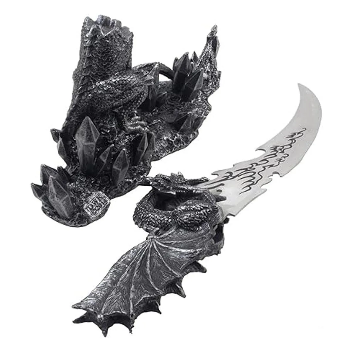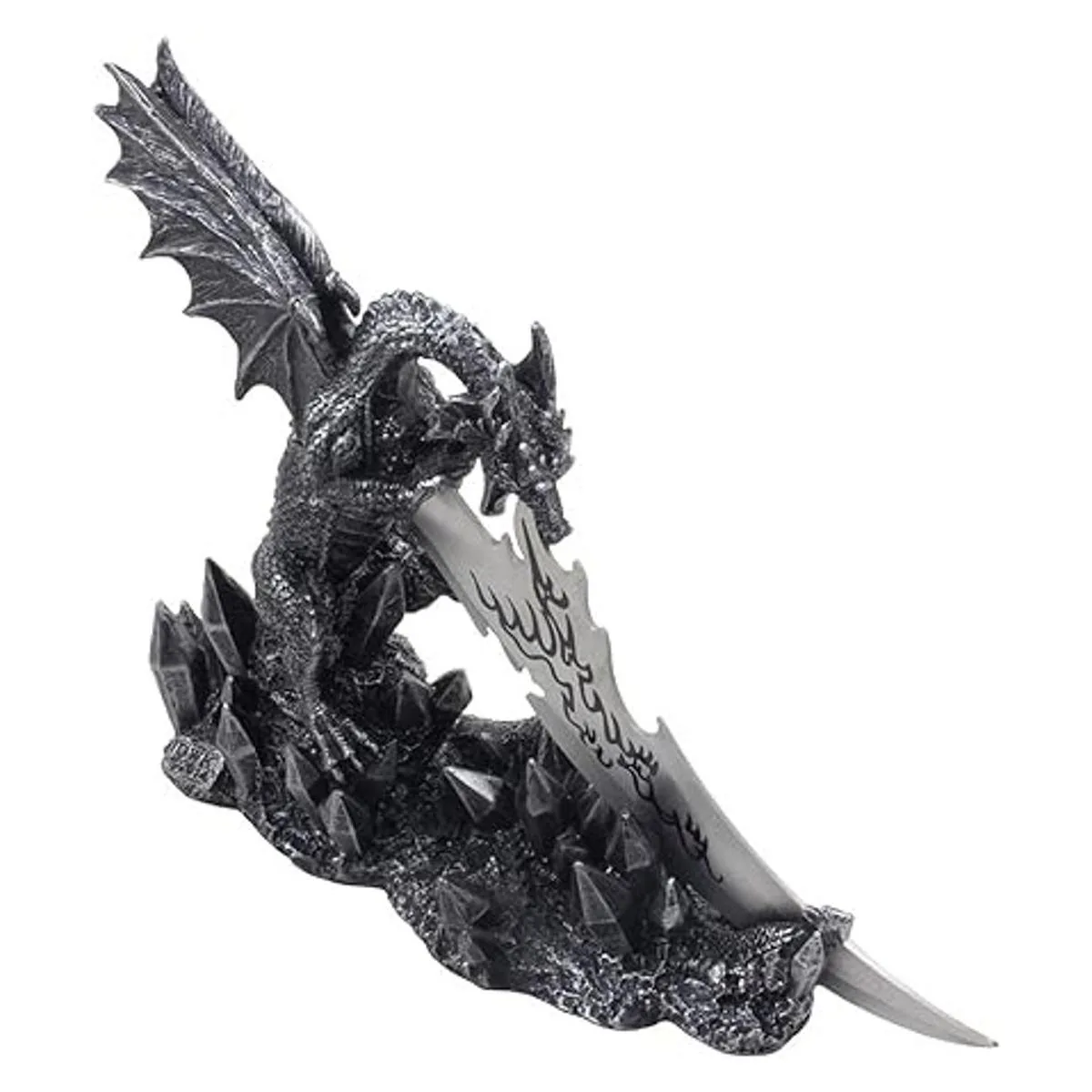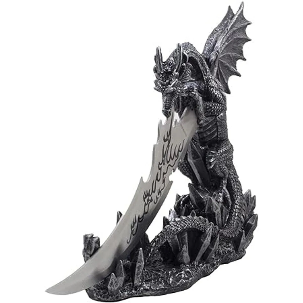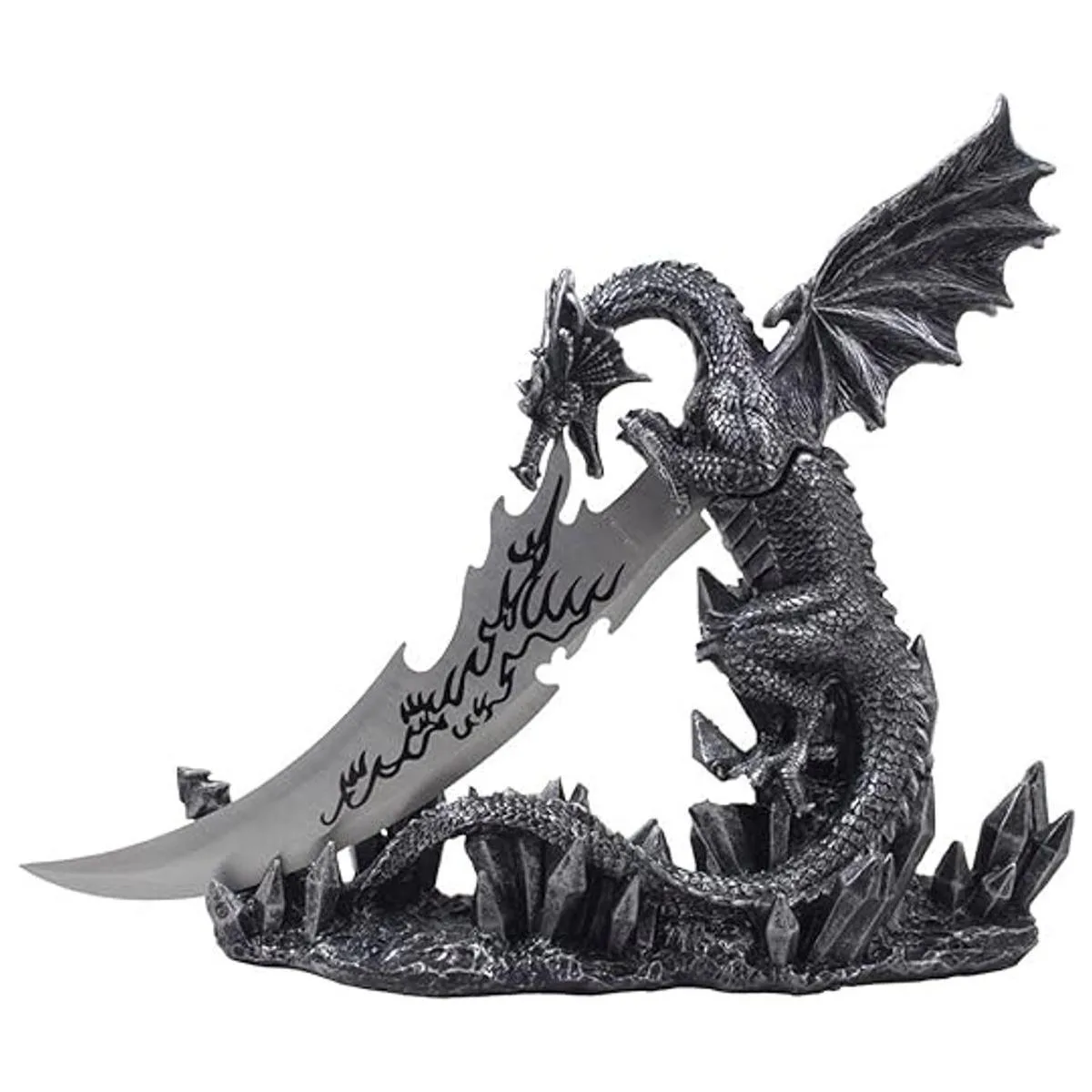 Cuchillo mítico de dragón guardián en estatua de soporte de exhibición para decoración gótica y medieval, dagas o repisas, decoraciones de escritorio y estantes como regalo decorativo de oficina para hombres