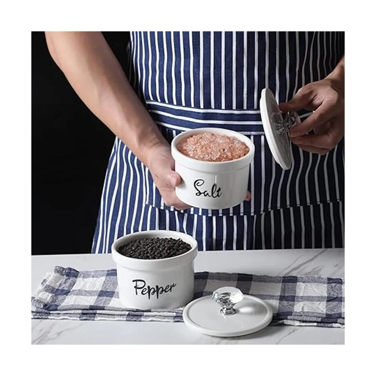 Cerámica de alta calidad: los recipientes de sal y pimienta están hechos de cerámica y son muy fáciles de limpiar. Puedes elegir lavarlo a mano o en un lavavajillas, lo que es seguro. A diferencia del acero inoxidable y otros materiales, la cerámica es frágil, pero si está bien protegida, puede ser elegante en tu cocina durante muchos años.