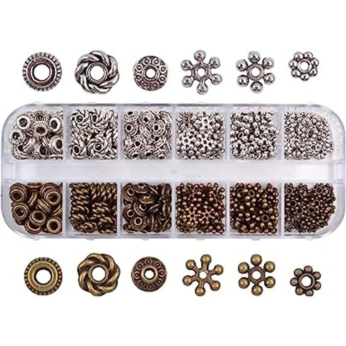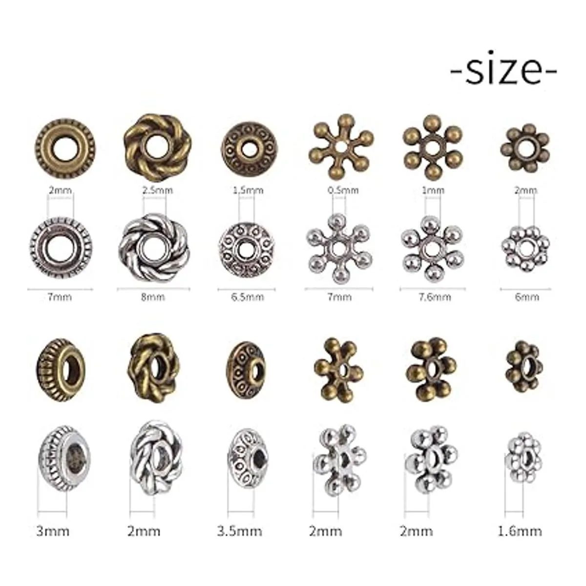 Cuentas espaciadoras tibetanas, 300 piezas de aleación de abalorios de joyería para pulsera collar joyería fabricación, 6 estilos, plata antigua y bronce
