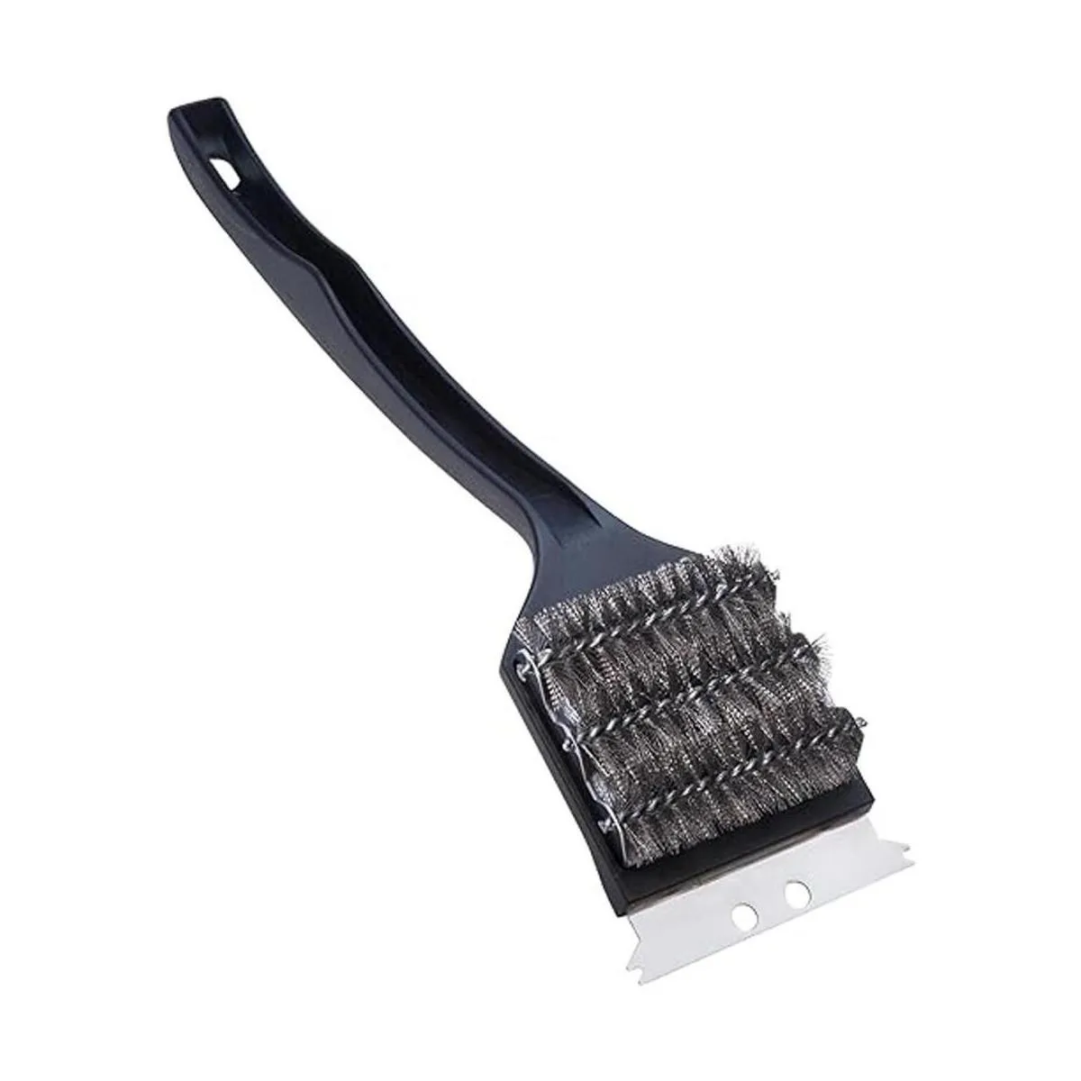 Rascador de acero inoxidable: el cepillo cuenta con un raspador de metal con extremos con muescas para limpiar peldaños individuales y eliminar desechos duros de las rejillas.