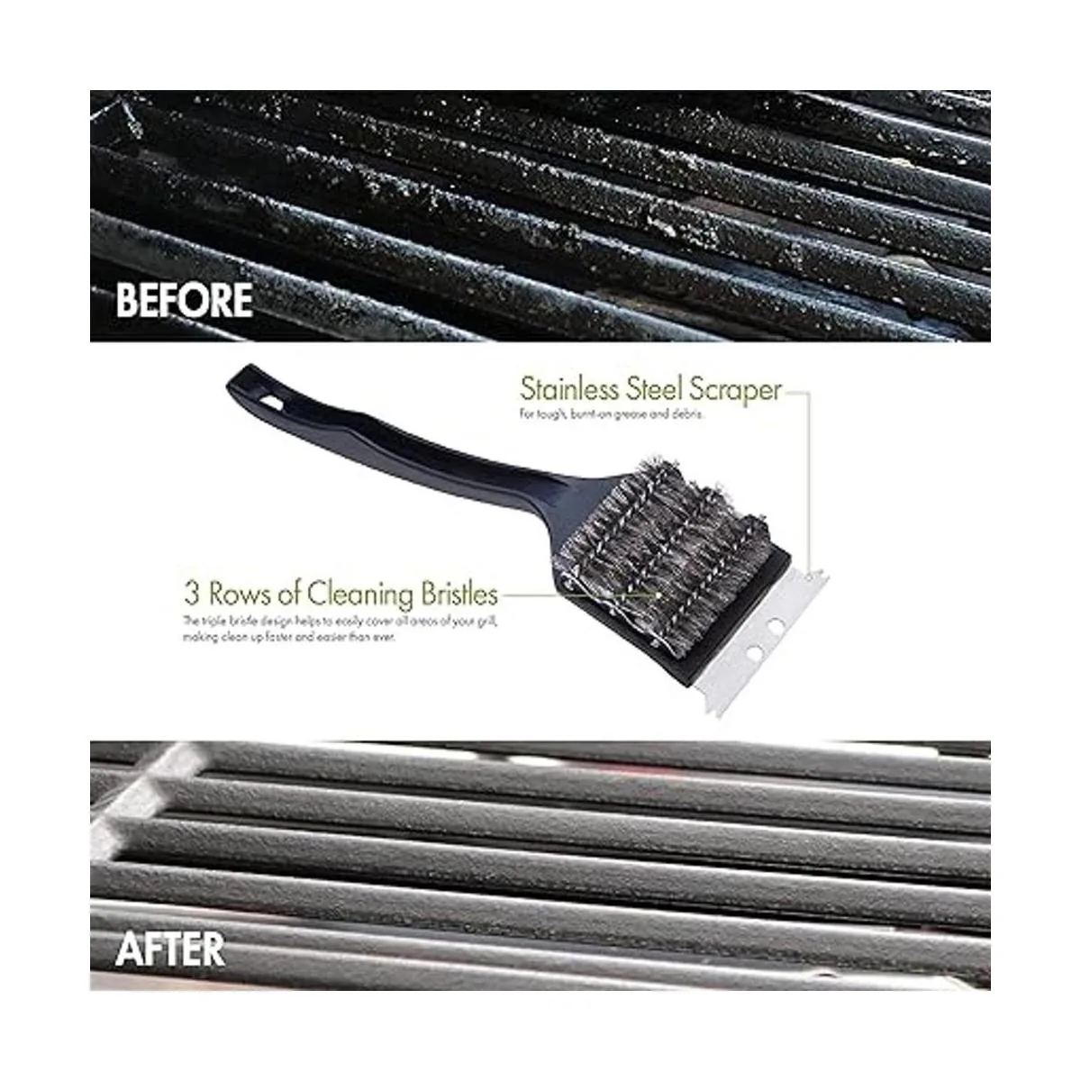 3 filas de cerdas de limpieza: tres filas de cerdas de acero inoxidable cortadas en múltiples ángulos patrón optimizado para darte el triple de potencia de un cepillo de cerdas individuales.