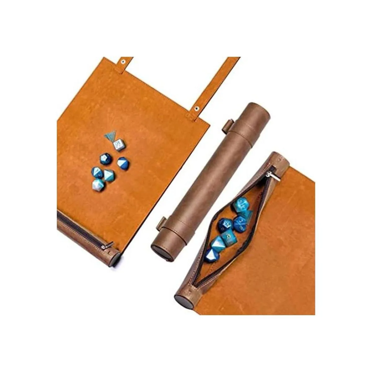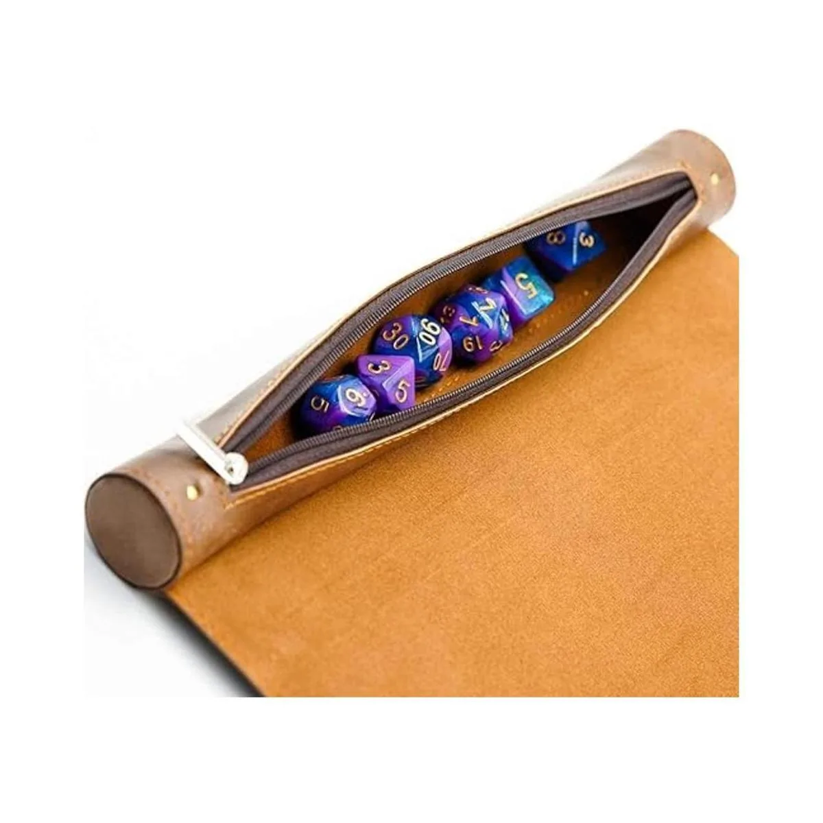 Cusdie Alfombrilla rodante de dados 2 en 1 y bandeja de dados con cremallera, compatible con dados poliédricos DND, mazmorras y dragón marrón