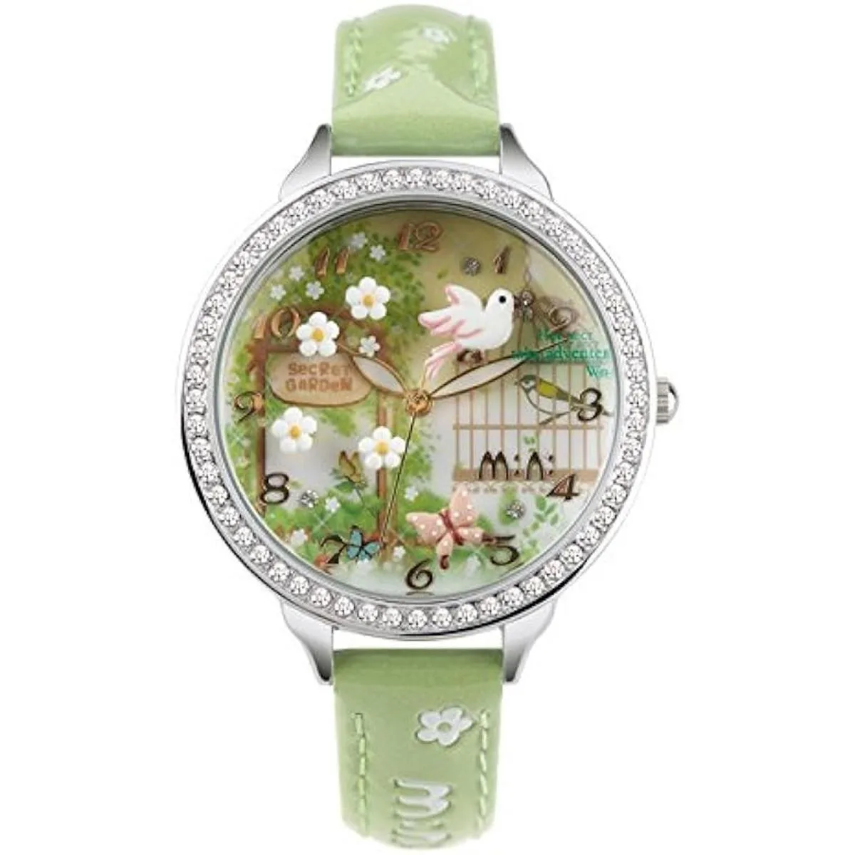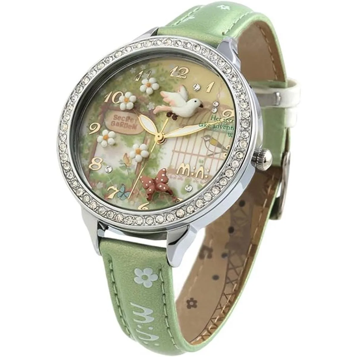 Bonita arcilla polimérica hecha de flores de paloma y mariposa, correa de cuero verde claro hierba, funda plateada, diamantes de imitación incrustados a mano