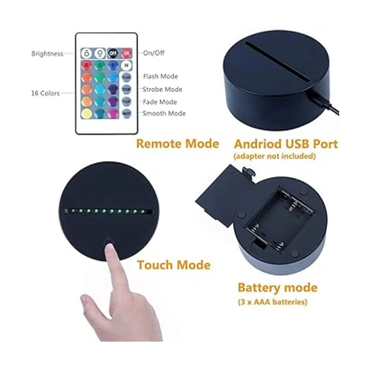 La luz nocturna acrílica de ilusión óptica 3D viene con control remoto y control táctil inteligente para ajustar los 7 o 16 colores diferentes como quieras. Con el mando a distancia, la luz nocturna se puede fijar en color estático o degradado para decorar la habitación de los niños, sala de estar, dormitorio, oficina, publicidad promocional, vacaciones, bar, tienda, guardería, cafetería, etc.