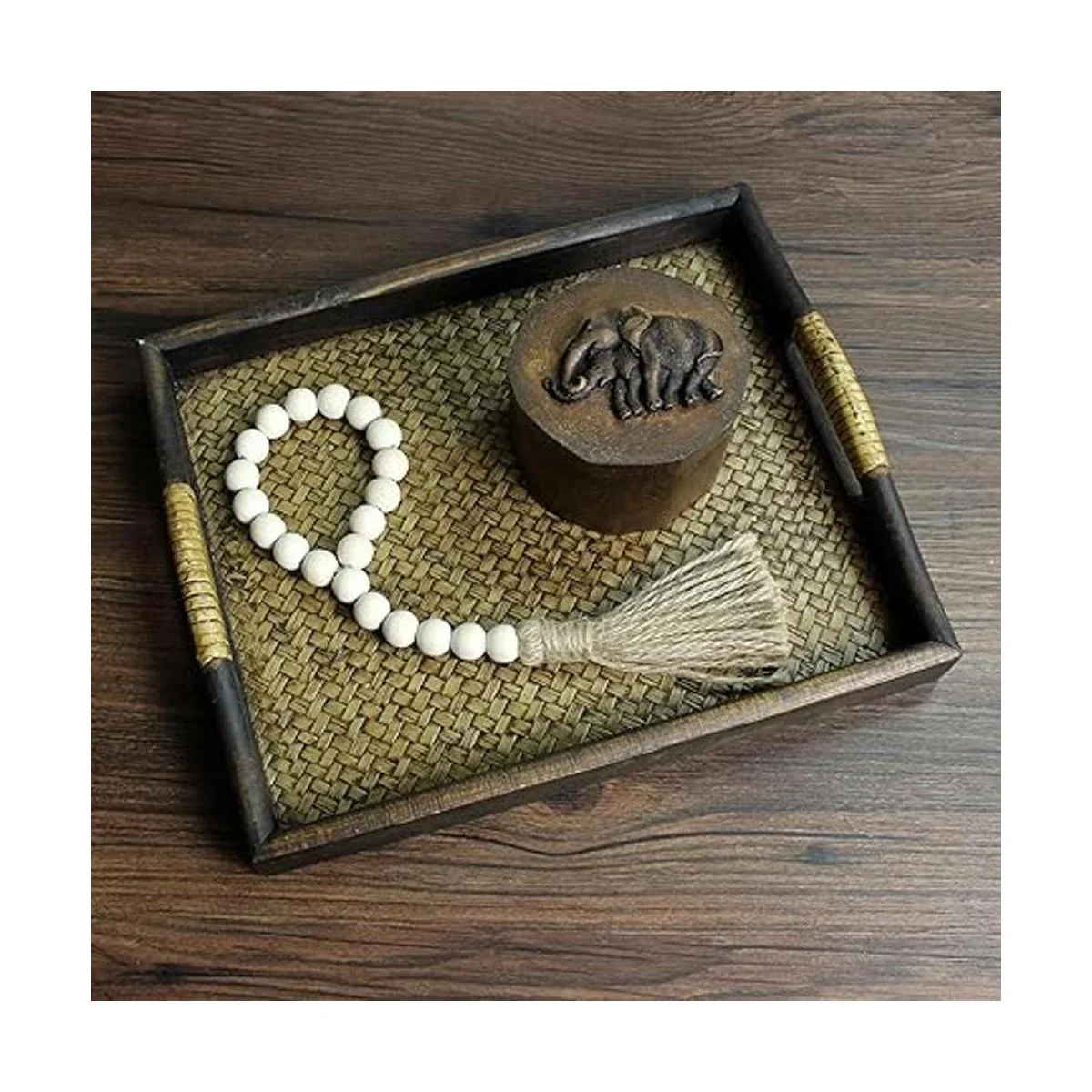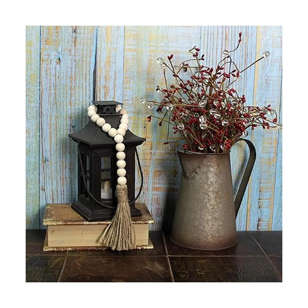 Hecho de cuentas de madera natural con cuerda de yute, encaja perfectamente en casas de campo, primitivos, campo, arte vintage, hogar y decoraciones al aire libre