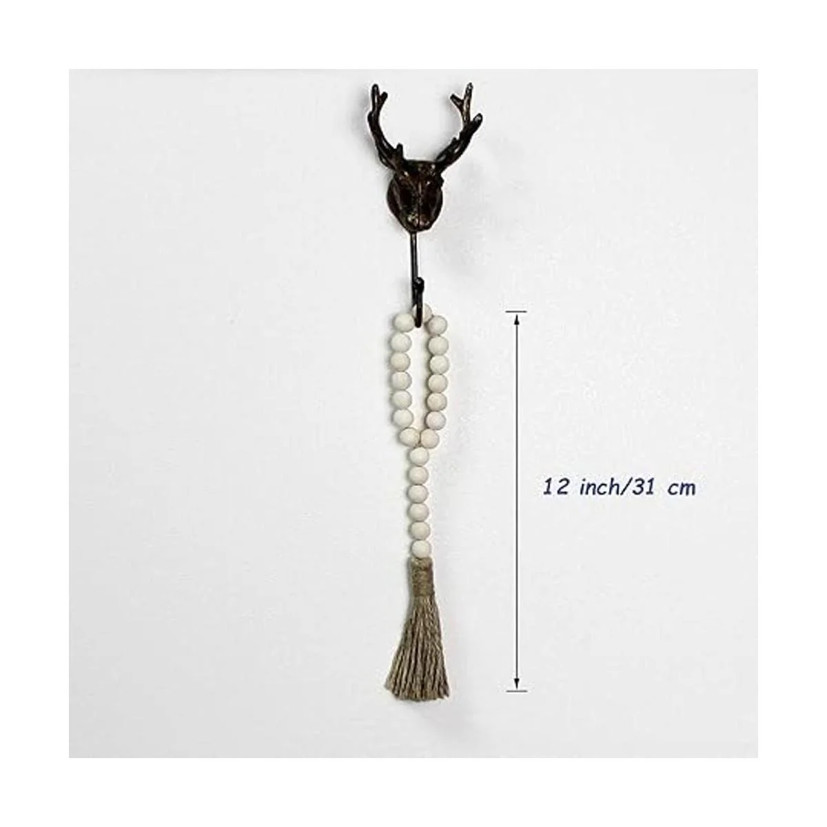 Medidas: la longitud total es de 12 pulgadas, el diámetro de las cuentas de madera es de 5/8 pulgadas, bucle de 21/2 pulgadas de diámetro, acabado de cuentas de color natural