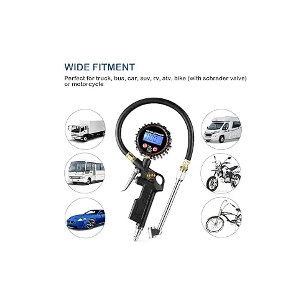 CZC AUTO Medidor de presión digital del inflador de neumáticos, indicador de desinflador de neumáticos con doble cabezal y manguera de goma MNPT, compatible con compresor de bomba de aire para camión, caravana, automóvil, motocicleta, autobús