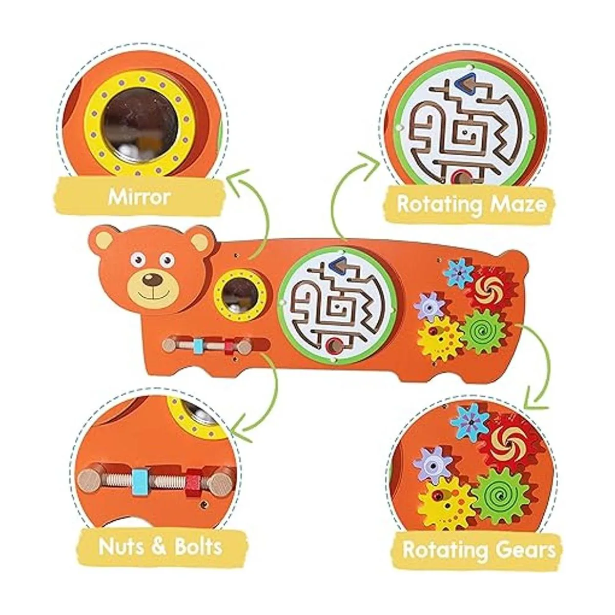 D DAKIN Centro de actividades de aprendizaje para niños pequeños, campo de tablero ocupado de oso de madera con divertidas actividades de aprendizaje a los niños les encantará jugar, juguete de aprendizaje sensorial de montaje en pared para sala de juegos y guardería infantil