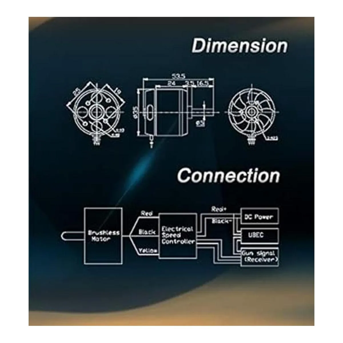 El tamaño del motor exterior sin escobillas es de 1.378 x 1.417 in, y el tamaño del eje es de 0.197 x 2.106 in, que es compatible con lipo 24S. El paquete incluye 1 motor sin escobillas D3536 y un juego de accesorios