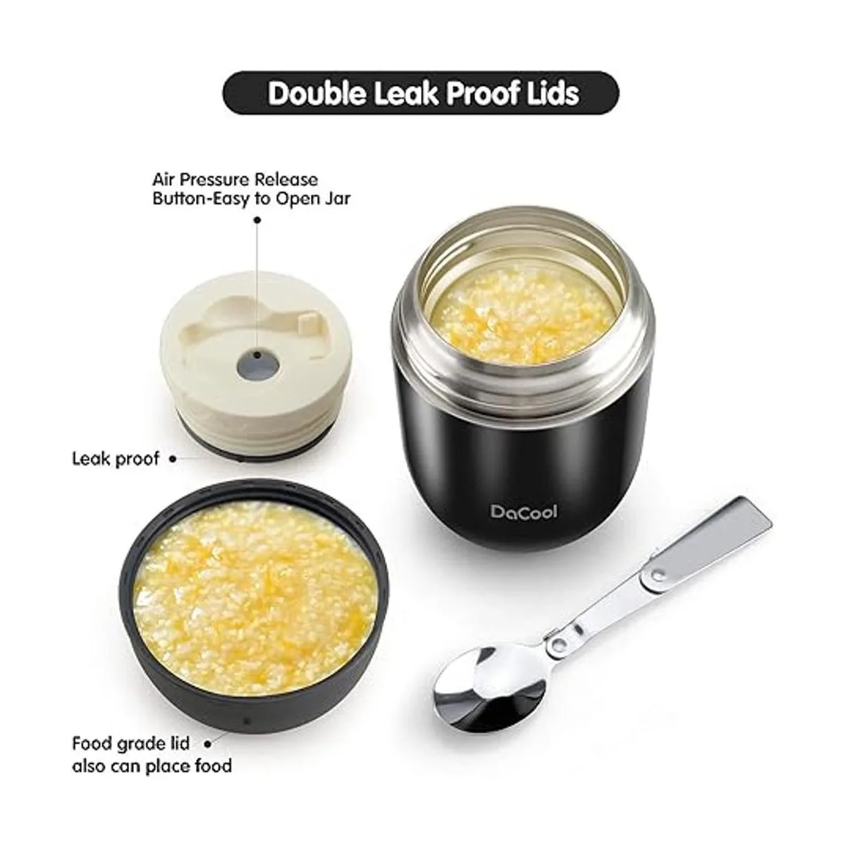 Double Lids Design The food grade material outer lid can be used to hold food, also be greater for insulation and leak proof, you will like the food jar with convenient leak proof double lids.