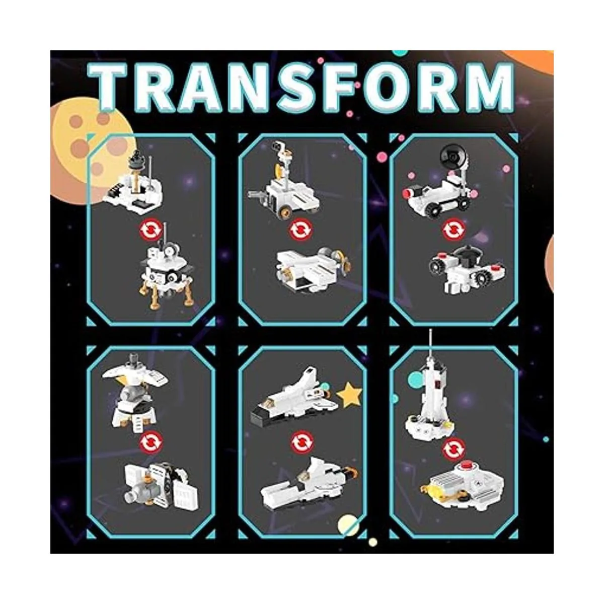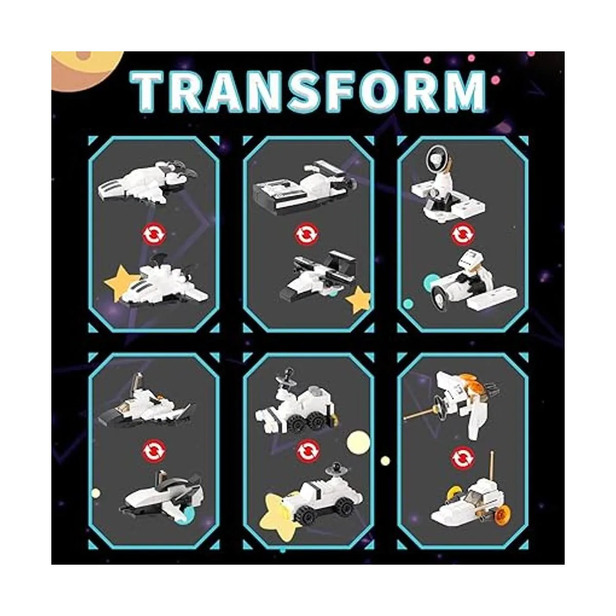 Opciones de construcción 25 en 1: podemos construir este juego de bloques de construcción en un transbordador espacial grande, o construirlo en 12 sondas diferentes de espacio pequeño, cada una de las cuales tiene dos formas para elegir, una variedad de opciones de construcción pueden enriquecer la imaginación de los niños.