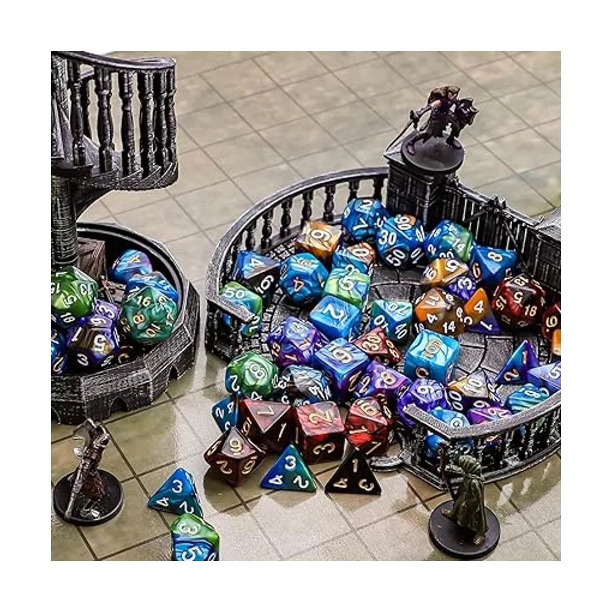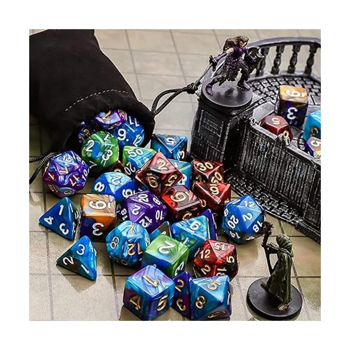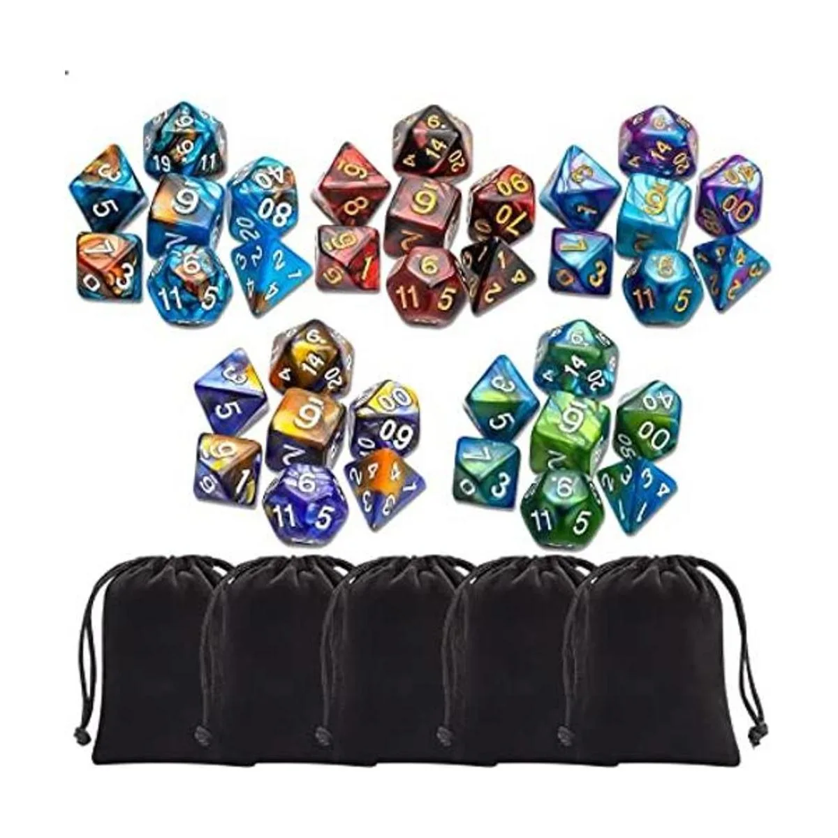 Juego de dados poliédricos: 5 juegos de dados poliédricos, cada uno de los cuales contiene 1 pieza d20, 1 pieza d12, 2 piezas d10 0090 y 09, 1 pieza d8, 1 pieza d6, 1 pieza d4; 35 piezas en total.